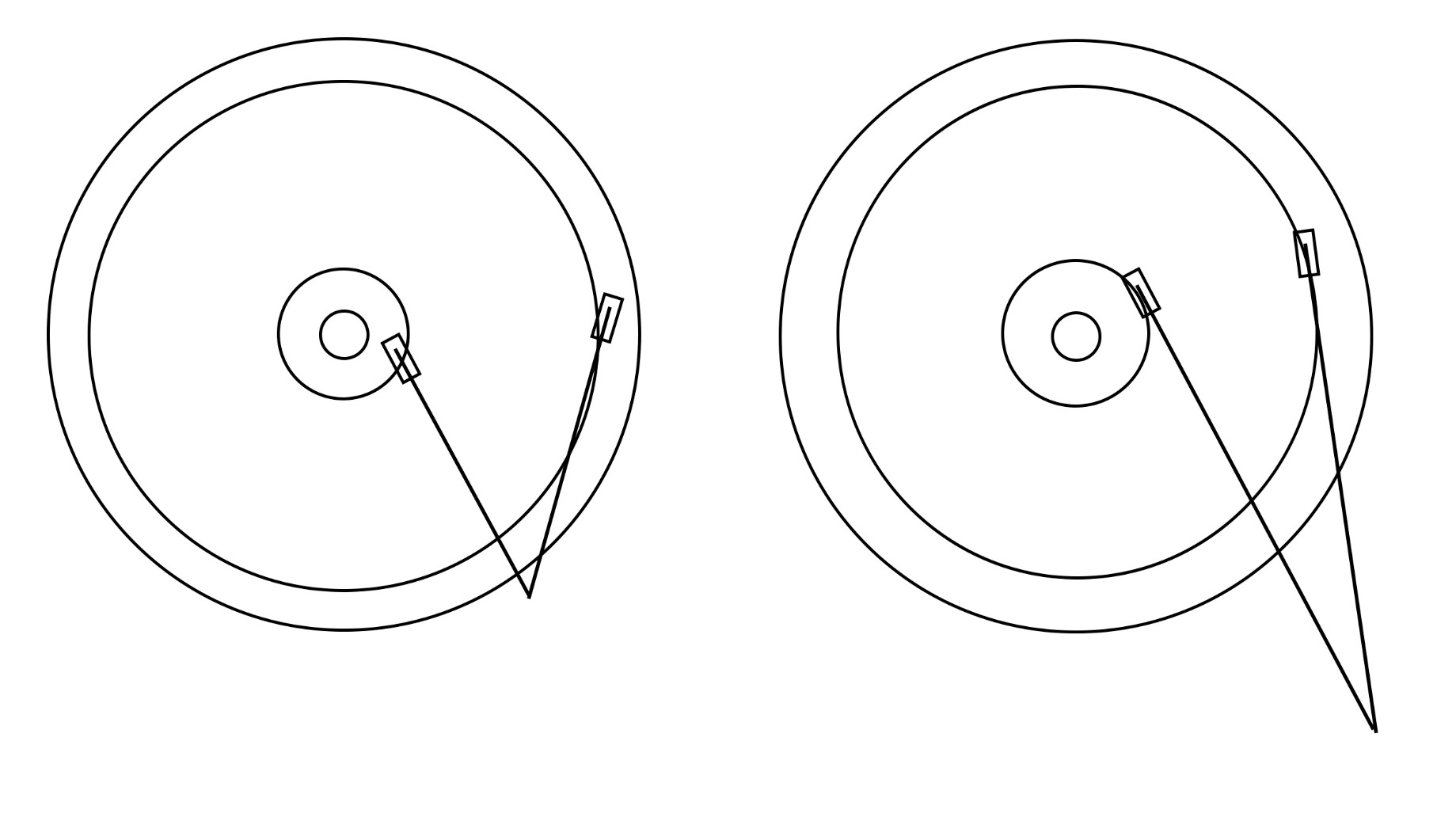 Очень схематично можно представить так. Игла в крайних положениях (начало и конец пластинки) Слева короткий тонарм. Игла встаёт поперёк дорожки. Справа длинный. Игла направлена по ходу вращения.
