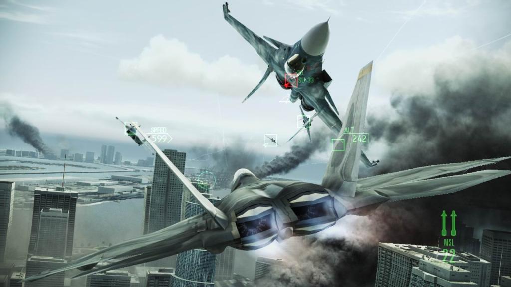 Итак, мы добрались до геймплея. И весь он состоит из принципа: летай и стреляй. Звучит не впечатляюще, правда? Но это ведь Ace Combat, а значит, переделанный геймплей будет реализован удачно, и беспокоиться не о чем. Игра даже без вмешательства всяческих скриптов и сюжетных сценок, будет очень часто генерировать интересные ситуации, вы ведь не думали, что все картинки это всего лишь арт? Большинство из них скриншоты, а значит красивых моментов будет очень, очень много. Чем не повод сделать пару-тройку заставок для своего рабочего стола? Основа геймплея итак понятна, поэтому пришло время разобрать «фишку» игры «Close-range assault battle system». Представьте себе, что вы играете не в авиааркаду, а в файтинг, где бой состоит из двух фаз, атаки и контр-атаки. А поскольку игра будет всячески защищать лидеров звена от ракетной атаки на расстоянии, вступать в такие бои придётся большую часть времени. И такие поединки бывают не всегда честными. Да, пилоты здесь довольно «социальные» и при первой же возможности зайдут в «ближний бой» целым звеном. А для того, чтобы удивить противника, у нас есть довольно большое количество вариантов дальнейших действий. Можно просто маневрировать, спикировать к земле и быстро набрать высоту (что делают 90% пилотов в онлайне, я уже и сам эту шутку оценил, а почему именно этот манёвр, вы узнаете в игре) или резко сбросить скорость. А можно воспользоваться тепловыми ловушками, использовать ракету, создающую помехи, либо красиво обдурить оппонента фигурой высшего пилотажа, которых у нас в арсенале целых три («Бочка», «Чакра Фролова», «Кобра»).