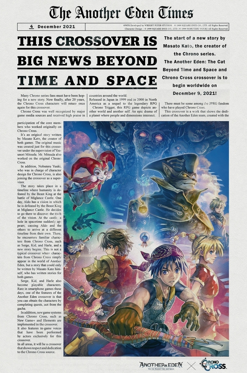 Этот кроссовер большой шаг во Времени и Пространстве. Мировая премьера новой истории Масато Като, сценариста серии Chrono, состоится 9 декабря 2021 года в кроссовере Another Eden: The Cat Beyond Time and Space и Chrono Cross!