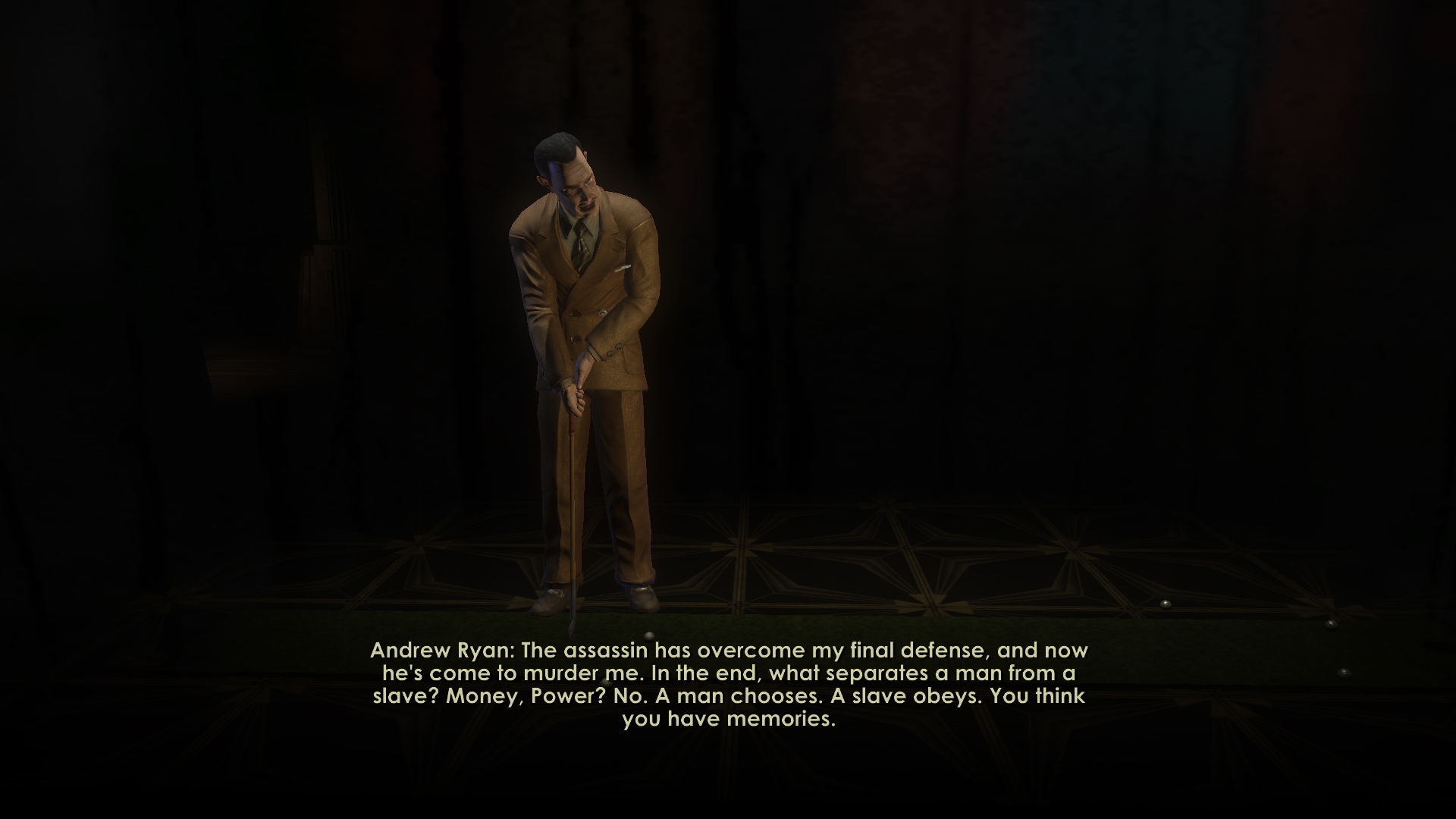 I am Andrew Ryan, and I'm here to ask you a question. Is a man not entitled to the sweat of his brow? 'No!' says the man in Washington, 'it belongs to the poor.' 'No!' says the man in the Vatican, 'it belongs to God.' 'No!' says the man in Moscow, 'it belongs to everyone.' I rejected those answers; instead, I chose something different. I chose the impossible. I chose… Rapture. A city where the artist would not fear the censor; where the scientist would not be bound by petty morality; where the great would not be constrained by the small! And with the sweat of your brow, Rapture can become your city as well.