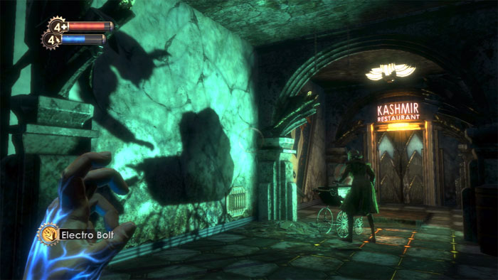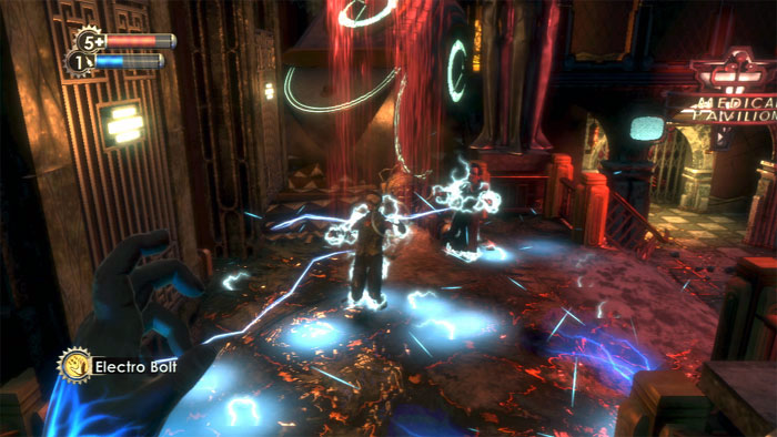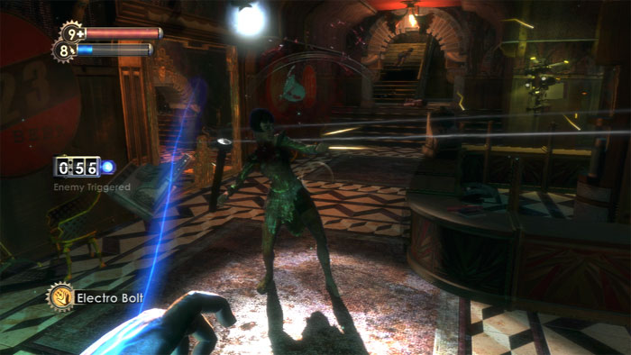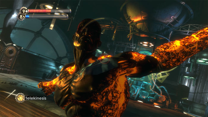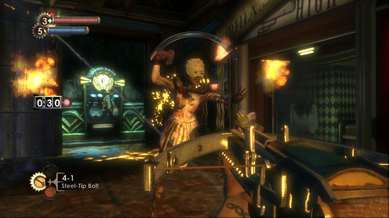 Теперь о геймплее. Он тут необычен. Нам дают не только пушки (которые, кстати, можно модифицировать – увеличивать магазин, повышать скорострельность и урон), но и, конечно, плазмиды. Последних в разы больше, чем привычного оружия. Первый плазмид, который нам дают – электрошок – позволяет открывать некоторые двери, убивать врагов, стоящих в воде. Можно по щелчку пальцев разжечь огонь – если на полу разлита какая-нибудь горючая смесь, то достаточно ее поджечь, и враги будут визжать от боли в итоге от них останутся одни угли. Можно превратить свои руки в улей – зрелище не из приятных… в руках появляются дырки, из которых вылетают пчелы. Думаю, не надо объяснять, что будет, если пустить стайку черно-желтых в бедного сплайсера. А еще можно почувствовать себя Дартом Вейдером – есть телекинез. Да, тут можно бросаться во врагов любым подвернувшимся предметом. А можно телекинезом доставать труднодоступные предметы. Вообще, плазмидов тут великое множество. Каждый имеет свой особый эффект. Плазмиды можно улучшать: повышать дальнобойность телекинеза, увеличивать мощь огня, электричества, и так далее.
