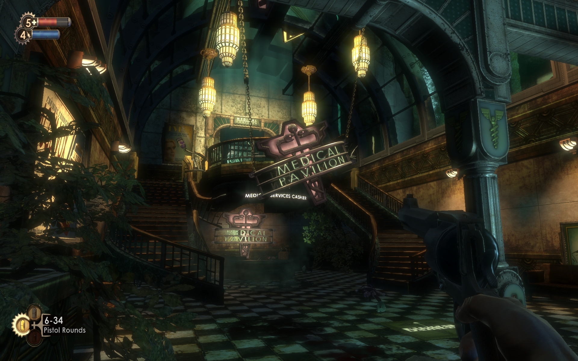 В графическом плане игра смотрится тоже довольно хорошо, однако, в том же году вышел первый Crysis… Тогда многие критиковали Bioshock за то, что, мол, в игре используется графика не самая современная. Однако, это одна из первых игр, использующих DirectX 10 (сейчас уже не поиграть под ним – нужна Windows Vista). Тут и шикарные эффекты с водой, огнем… И про все недочеты в техническом плане быстро забываешь, когда видишь эти шикарные интерьеры, слышишь прекрасный саундтрек.