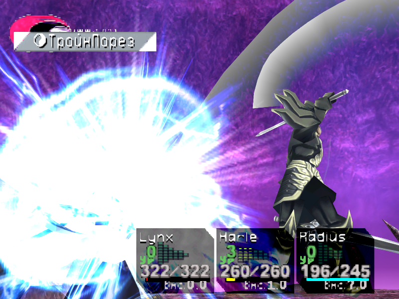 Очень, очень сильный босс. Своим техом [СвятТяжМеч] он может нанести до 400 НР урона! Атакуйте техами Линкса и других черных персонажей, используйте [ЧернДыру] и [СвобПаден] и победите его.