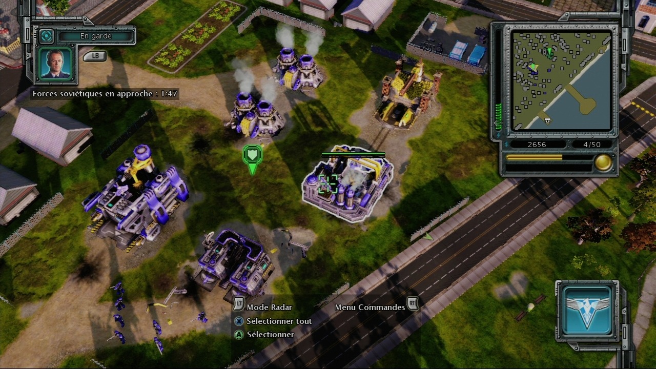 Увеличить миниатюрную карту можно одним нажатием кнопки, благодаря такой карте можно легко перемещаться в необходимые локации. Командное меню представляет собой круг, разбитый на секторы. Им можно воспользоваться в любой момент, если требуется моментально заказать войска или активировать строительство. Получается даже проще, чем на РС, так как нажимать следует одну и ту же кнопку и регулировать направление стиком. Например, при нажатии вправо-крест получаете бараки для солдатов, при нажатии вверх-крест – электростанция. В зависимости от типа войска и здания подразделяются на категории, что позволяет ускорить и упростить их поиск.