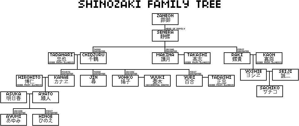 Прежде чем перейти к разбору, собственно, нашего предмета изучения, стоит обратить внимание на среду, в которой персонажу пришлось расти. Ситуация тут сложилась отнюдь не самая простая: семья Аюми относится к роду Шинозаки, представительницы которого из поколения в поколение наследуют некие духовные силы. Об отношениях с родителями информации практически нет, но сделать кое-какие выводы всё-таки можно.