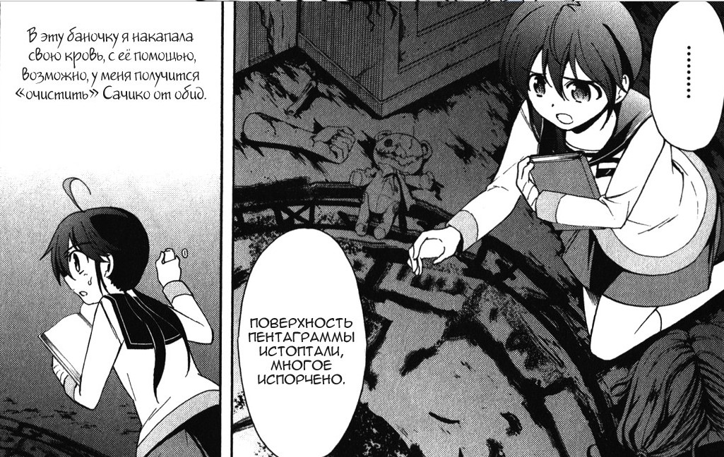 Сам факт того, что кто-то может попробовать исполнить ритуал чёрной магии из неизвестной книги в доме-призраке, да ещё с условием того, что написан этот ритуал на совершенно непонятном языке с пометками на родном, казалось бы, противоречит здравому смыслу. Однако именно такой нелепый поступок может указывать на то, в каком состоянии находились ребята, пережившие трагедию. Аюми, прямо или косвенно ставшая виновницей проведения ритуала Сачико и, следовательно, гибели троих одноклассников и любимой учительницы, в такой ситуации жаждала исправления ошибок больше, чем чего-либо. Всё лишь осложняло состояние Наоми, которая и сама была готова совершать ошибки; осознавая свою роль в произошедшем, Шинозаки явно не могла найти себе места в поисках возможности хоть что-то исправить. Сглаживание ошибок стало главной задачей Аюми: здесь роль сыграли не только ответственность, чувство вины и желание помочь — школьница сама не смогла простить себя и позволить себе принимать поддержку и заботу окружающих. Только исправление ошибок могло помочь Аюми в полной мере почувствовать себя достойной так необходимого старосте тепла — а так как оно действительно ей постоянно необходимо, то способ достижения желаемого уже не имеет значения. В этот момент мы можем даже говорить о понятии психологического мазохизма — не имея в виду при этом ничего, связанного с извращениями.