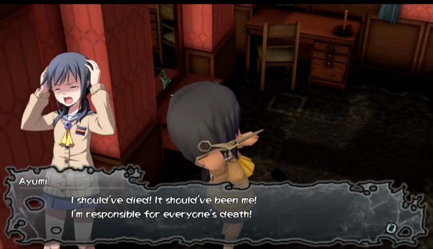 Разумеется, информация о персонаже в естественной среде обитания мало что означает для желающего ознакомиться с серией Corpse Party, ибо эти игры относятся к жанру хоррор и совсем не жалеют главных действующих лиц. Большую часть действа игрокам приходится лицезреть Аюми в экстремальных условиях, а это, скажем прямо, зрелище не для слабонервных. Именно такой шаг, впрочем, позволяет создателям по-настоящему раскрыть персонажа и позволить наблюдателям увидеть, что за маской ответственной старосты и королевы хоррор-историй скрывается не слишком-то и уверенный в себе человек, болезненно жаждущий внимания окружающих и чьей-то поддержки, а также накопивший немало комплексов. Запугиванием окружающих страшилками Шинозаки вполне может пытаться не только отвлечь их от собственных пугливости и впечатлительности, но и получить внимание, добиться расположения. То же можно сказать и о занятии ответственной должности: пост старосты может компенсировать недостаток внимания и заботы (например, недополученной от родителей) и позволить Аюми почувствовать себя по-настоящему нужной и значимой. Увлечения и мечты о будущем школьницы также выдают в ней человека творческого склада ума, а значит почти наверняка впечатлительного и ранимого. Всё вместе в ситуации, когда привычная реальность уходит на второй план, способно привести к настоящей катастрофе.