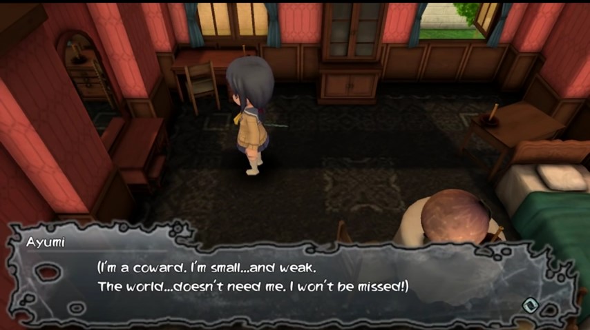 Несмотря на столь опасные действия, Аюми вовсе не собирается умирать — это сразу замечает Мисто, жестокие слова которого сначала заставляют школьницу попытаться доказать ему серьёзность своих намерений, а потом прекратить всё, чтобы не потерять лицо окончательно. Её гордость ещё никуда не девалась. Обесценивание эффекта жалости к себе сбивает Аюми с толка: после явления незнакомца она полностью подавлена.