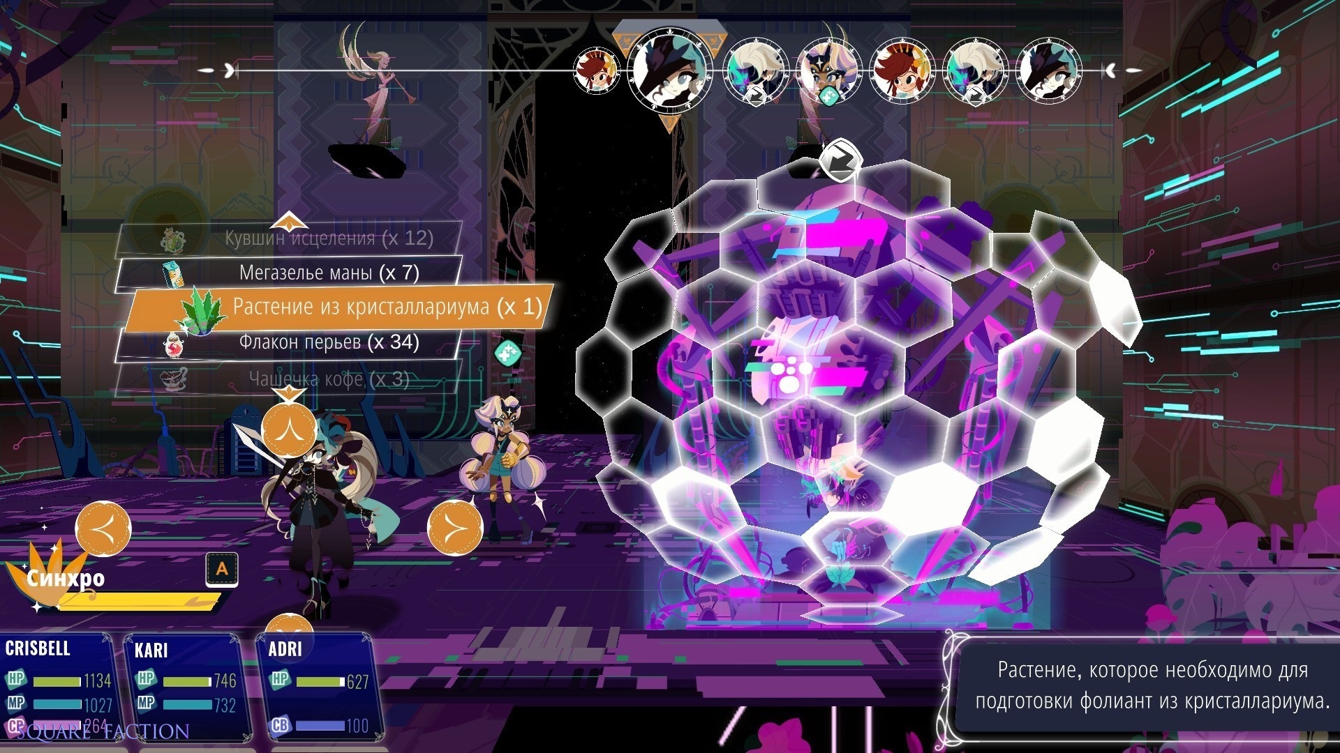 • В комнате собрания перед решающим сражением поговорите с Адри. В соседней комнате начнется разворачиваться ее задание. Существует Пятый Свидетель, которого боится даже Ардо. Его пробудила ото сна Адри. Потому она решила присоединиться к команде, чтобы справиться с новым врагом. Какие опасности подстерегают наших героев? Получите «Растение из кристаллариума».