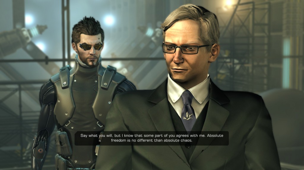 Третий промах сценаристов это персонажи. Публика насмехалась над неуклюжей анимацией бега в присядке протагониста Альфа Протокола, однако то, что Eidos Montreal использовала всего один набор шаблонов анимаций диалогов на всех второстепенных NPC в HR, с почти нулевой лицевой анимацией и жестикуляцией 3PO из Звёздных Войн (обратите внимание, как они неуклюже дрыгают руками во время разговора), никого не смутило. Даже те персонажи, что играют важную роль в сюжете, плоские и неубедительные. В начале игры Дженсена донимали соболезнованиями по поводу «гибели» его адски непривлекательной бывшей подружки, но игра не потрудилась её обрисовать так, чтобы сместить мою шкалу отношения к персонажу с отметки «полное безразличие». Дэвид Сариф одна из ключевых фигур, абсолютно не оставляет впечатления главы мегакорпорации, которая стоит на рубеже того, чтобы изменить мир, каким мы его знаем, раз и навсегда. Он всё расхаживает по кабинету, играется с мячиком, мямлит что-то, даёт указания, после которых почему-то долго объясняется. Иногда он злится, и каждый раз, когда Дженсен его ловит на тёмных делишках или лжи, начинает неловко извиняться и оправдываться. После харизматичного, властного, уверенного в себе, хитрого и невозмутимого Генри Леланда, Дэвид Сариф смотрится просто жалко.