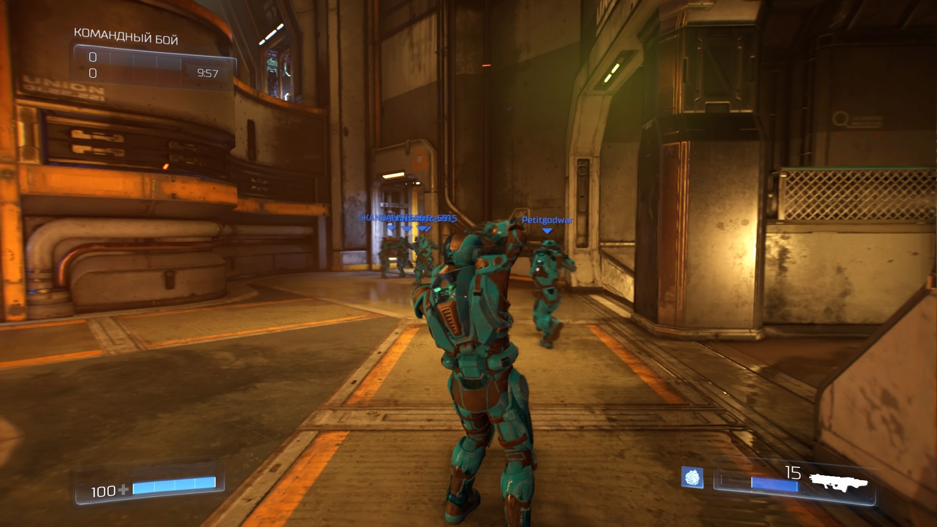- О прыжках: каждый боец экипирован реактивными двигателями. В воздухе можно сделать двойной прыжок. У двигателей есть короткий кулдаун если один раз попытался куда-то допрыгнуть, то потом вторая попытка без задержки исполнить двойной прыжок будет обречена на провал (высота второго прыжка будет очень маленькая). Так что даже не пытайтесь, не останавливаясь, прыгать через две одинаково отстоящие друг от друга кочки на пропастью лавы.