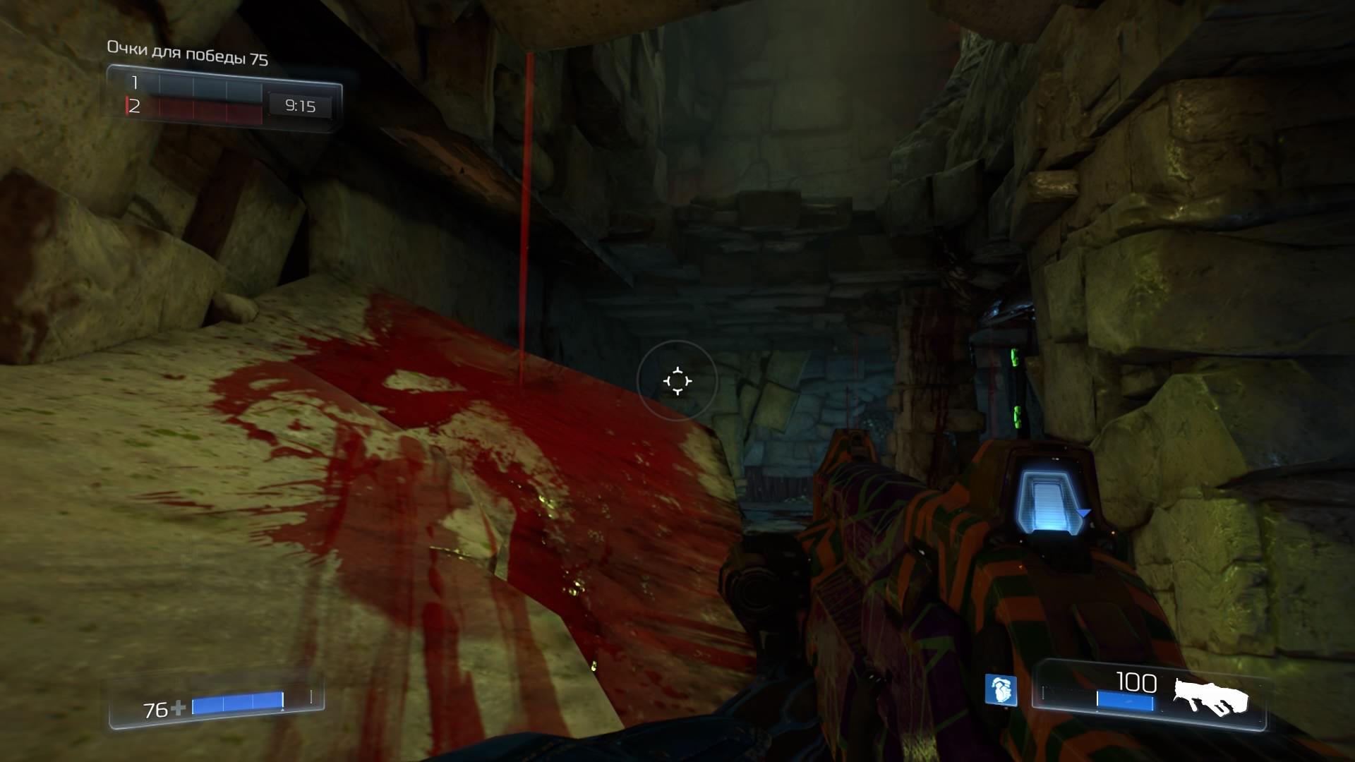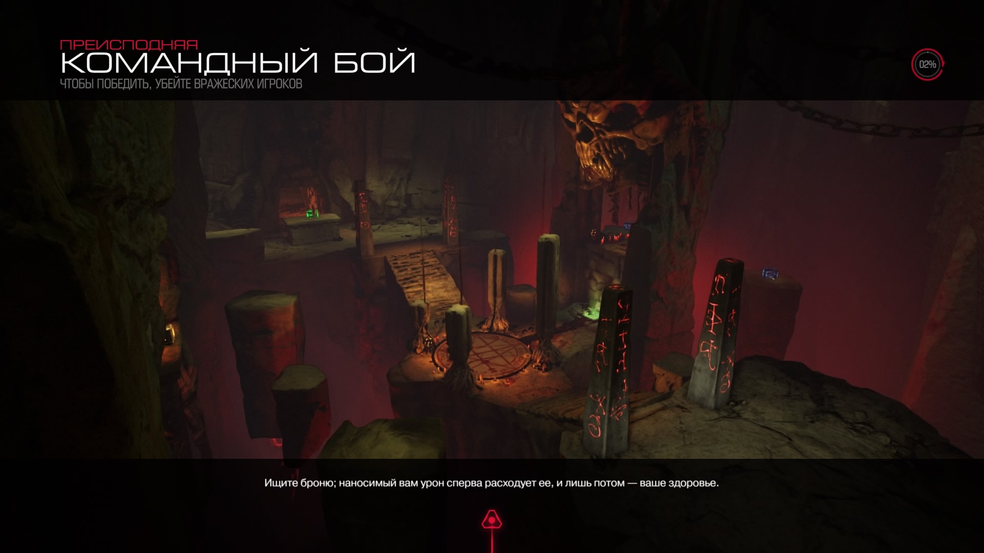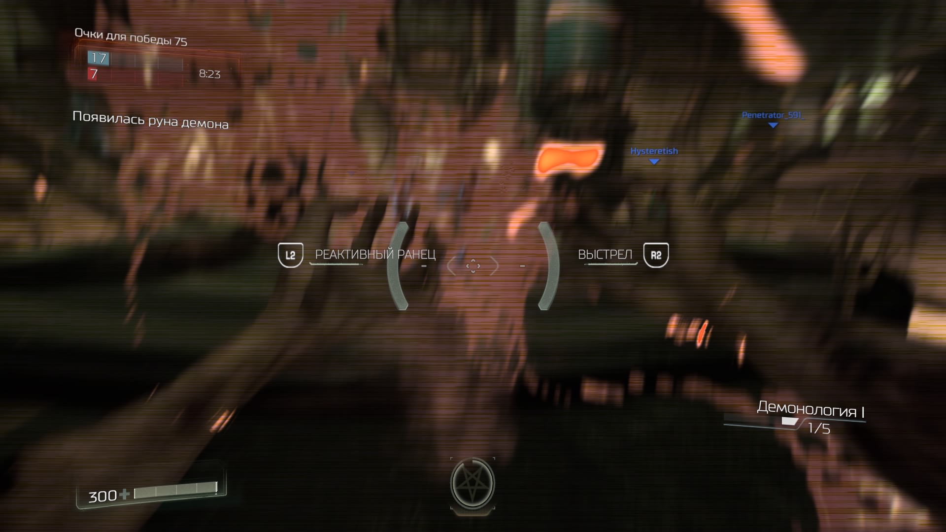 - Важная деталь если в бою вы почувствовали, что в вас сзади стреляют (экран краснеет, красные стрелки по углам экрана указывают направление и количество атакующих), то мой вам совет не убегайте. Это бесполезно, тем более, что и бега в этой игре нет, как такового. Скорость движения все время одна, кроме указанного выше ускорения в начале матча. Так что оборачивайтесь и давайте отпор. Можно прыгать, прятаться на уровне ниже, пользоваться порталами, телепортами-печатями, лифтами, но ни в коем случае не убегайте. Давайте отпор. Стреляйте в ответку. В этой игре по-другому никак. Или ты, или тебя. Грамотная команда сбивается в кучу. Ну и золотое правило: бегайте за дружественным демоном, авось от него кусок перепадет, лишний фраг +1. Но вообще Ревенанта надо защищать. Так как я писал уже выше можно наблюдать ситуацию, когда одна печать демона кочует из рук в руки между командами раза 3-4. И это за 2-3 минуты действия призыва.