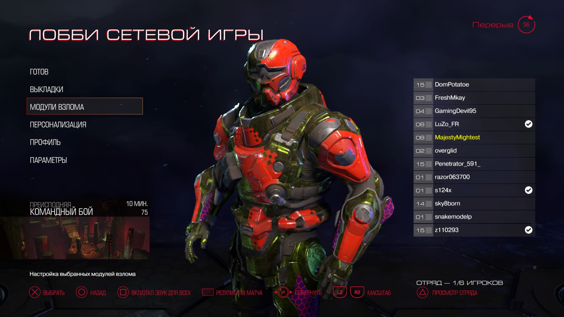 - В мультиплеере есть одноразовые бусты: их называют «модули взлома». Каждый модуль при активации имеет ограниченное время действия. После гибели модуль не пропадает, просто таймер действия приостанавливается. Можно свободно переключаться между модулями в момент респа. Это значит, что, даже если еще действует первый бустер, ты можешь активировать второй, при этом таймер первого модуля взлома просто приостановится. Всего во время боя доступно 4 ячейки для модулей. Примеры модулей: 1) после смерти вы видите врага, убившего вас 2) вы видите таймеры респа снаряжения (патроны, броня, аптечки) 3) вы видите места респа супероружия и демонического маяка, также показано расстояние до них в метрах и время респа 4) за каждое убийство вы получаете дополнительные 75 опыта. 5) Вы видите линейку хп и брони у каждого врага. Каждый модуль взлома имеет много рангов. Например «Магнит для супероружия I», «Магнит для супероружия II» и так далее. Эти модули выпадают во время битвы случайным образом. Может быть и такое, что у тебя в двух из четырех ячеек два одинаковых модуля, но просто разных рангов. Такое позволяется.