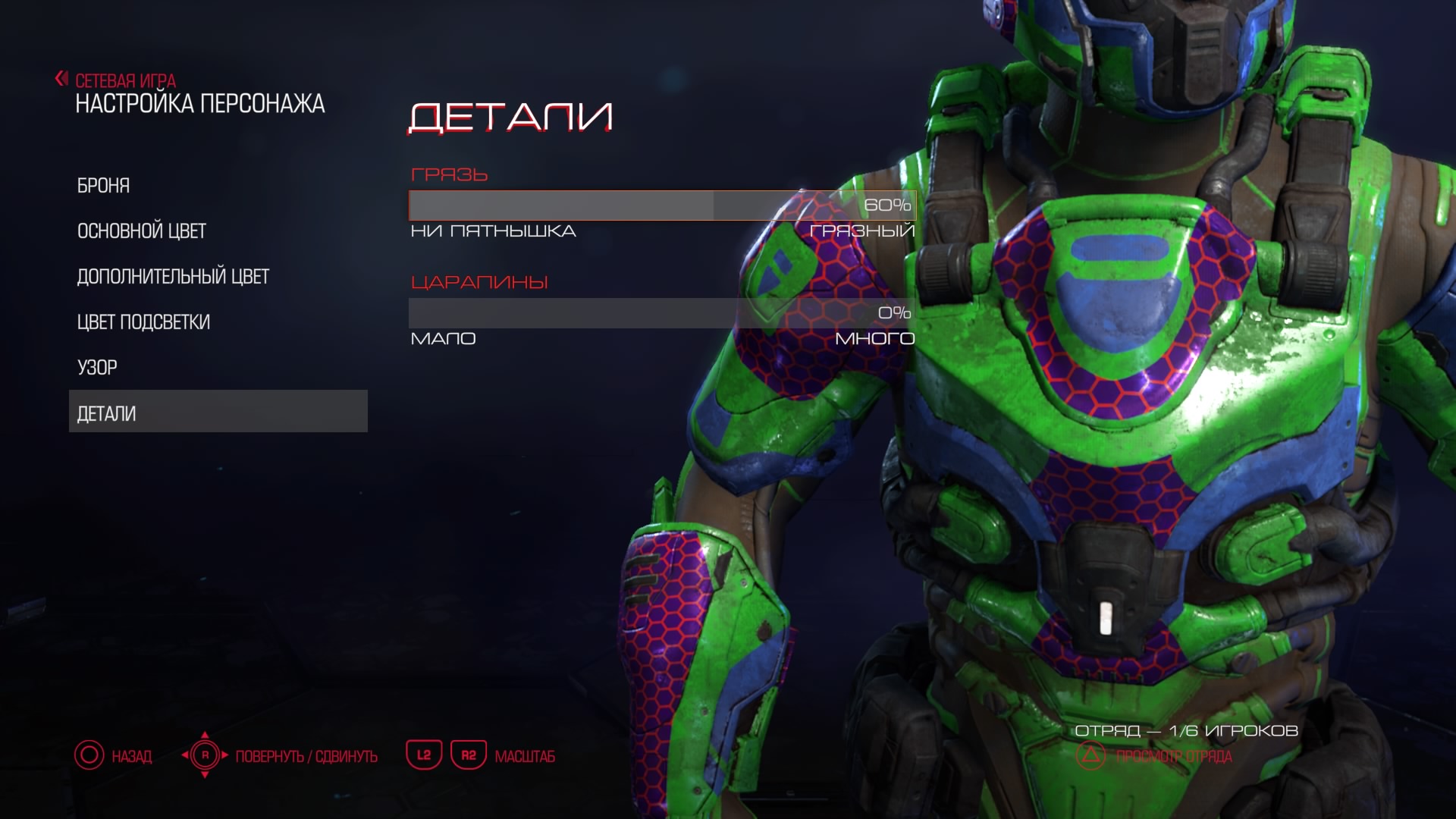 - Важная деталь кастомизации и оружия, и одежды: ГРЯЗЬ и ЦАРАПИНЫ. Да-да, вы не ослышались. Можно задавать для каждого оружия степень потертости, изношенности, как много будет царапин на нем, облупится краска и так далее. Какой слой грязи будет на одежде, пыльным ли будет стекло шлема. Эти параметры так и называется бегунок грязи и бегунок царапины. Созданные с грамотным распределением всех указанных выше настроек персонажи обладают своим уникальным шармом, который часто указывает на отсутствие или наоборот наличие творческой нотки у игрока. Ближайшие аналоги: кастомизация в Borderlands и кастомизация в XCOM 2. От Борды цвета, типы головы (шлема). От Икскома узоры, матовость, металлические цвета и так далее.