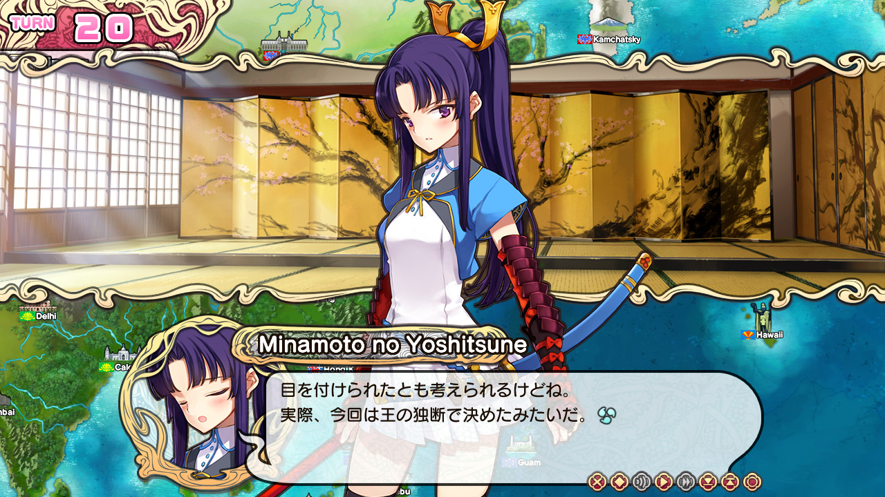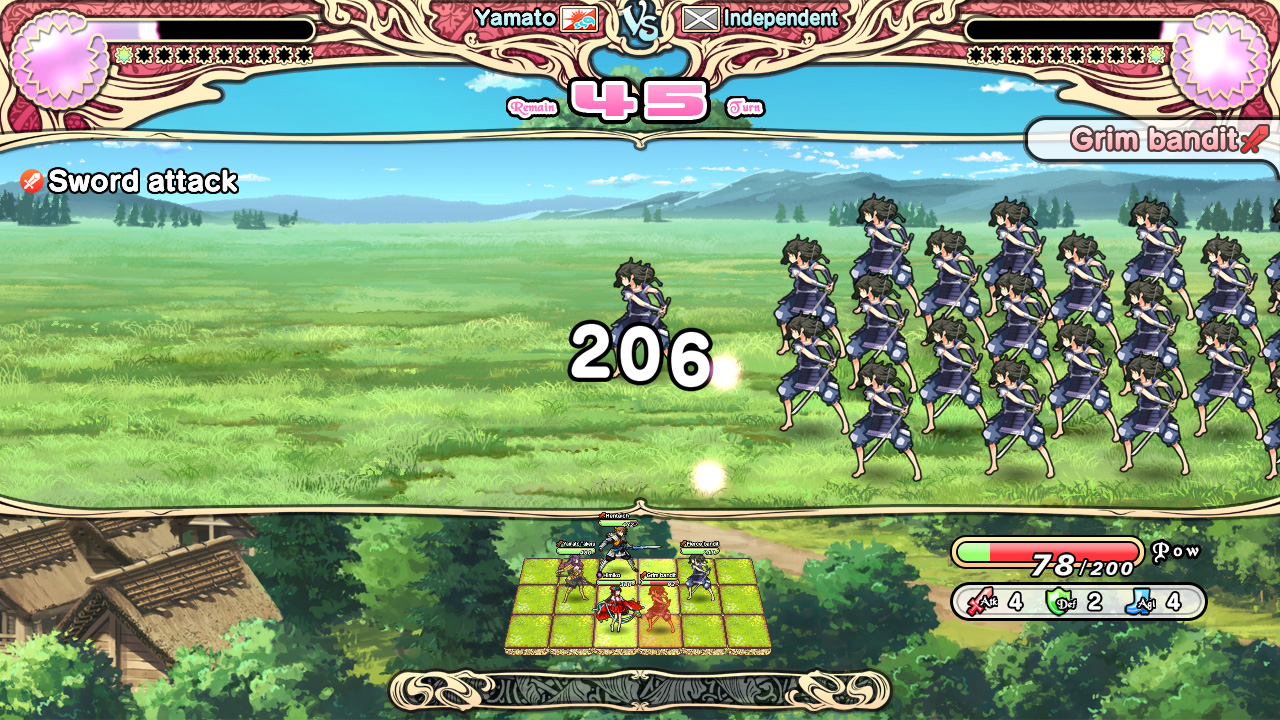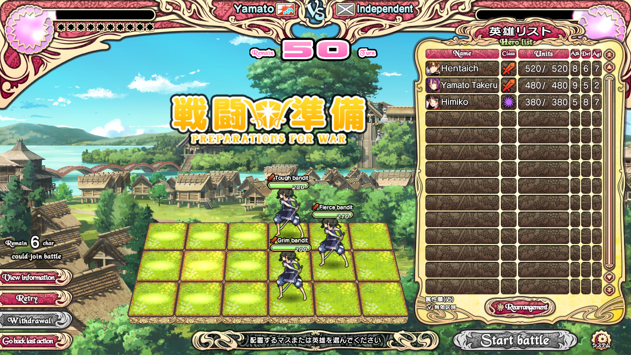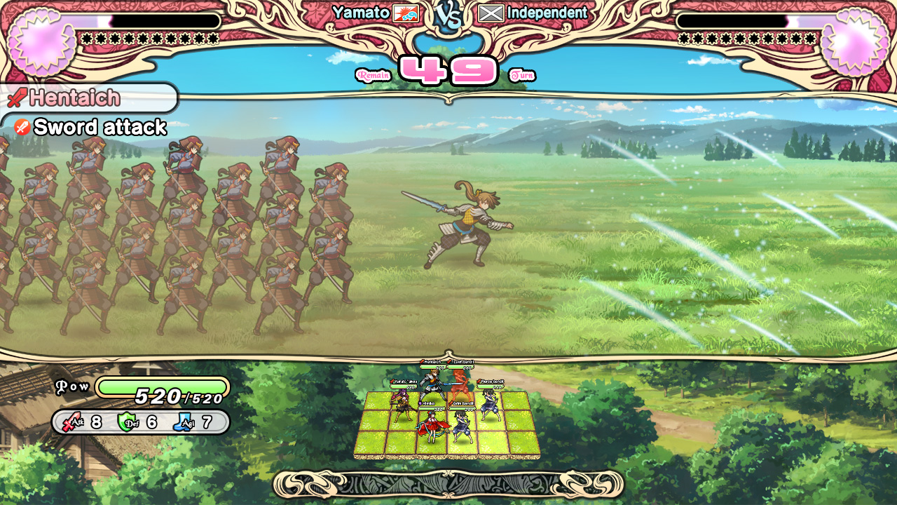 Несмотря на то, что львиную долю игры занимают разговоры наших подопечных друг с другом (ведь, в первую очередь, это визуальная новелла), повоевать нам всё же дают. Место битвы представляет собой площадку, состоящую из 18 клеток по 9 для наших и вражеских войск с каждой стороны. Вверху по бокам расположены шкалы храбрости для нас и противников, которые будут заполняться в процессе сражения. Заполнив полностью шкалу, мы получим один блок храбрости (Brave). Эти блоки нужны для проведения специальных атак и техник юнитов. Посередине находятся флаги с названиями противоборствующих стран, а чуть ниже количество доступных ходов. Каждое сражение ограничено 50 ходами (за исключением битв с главами государств). Это общее количество ходов как для нас, так и для наших врагов. Если по их истечении мы не одолеем армию противников, битва будет проиграна, а игра закончится.