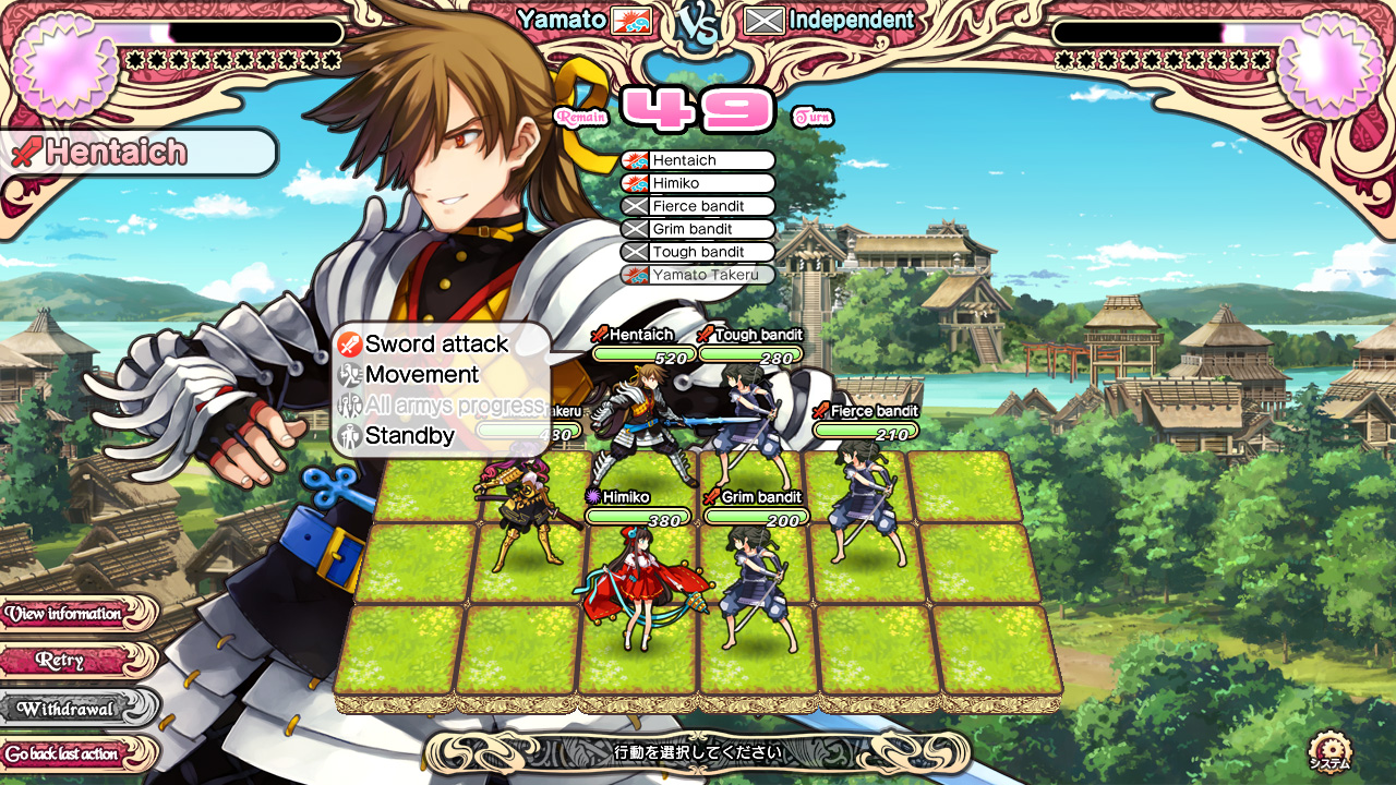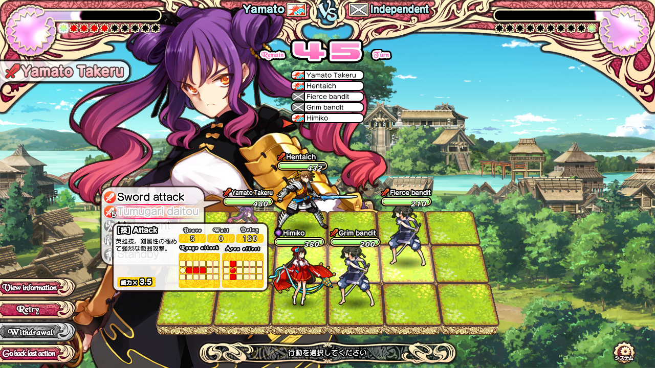 Случайным образом игра будет генерировать очередь из наших и вражеских солдат. После этого в появившемся окошке нам покажут возможные действия нашего юнита, который будет сейчас ходить. Первой строкой идёт обычная атака, которая не требует каких-то затрат. Далее идёт список специальных приёмов, на которые нужны упомянутые выше очки храбрости. У протагониста и Химико будет сразу доступен один специальный приём. Всего же их