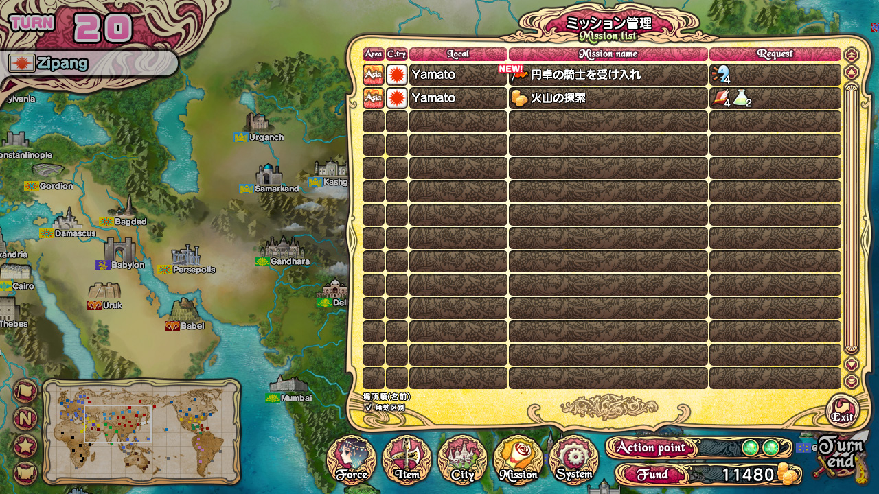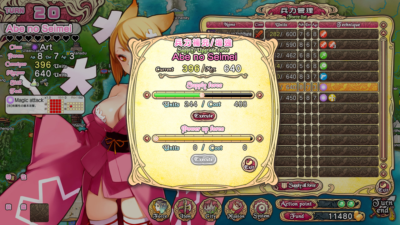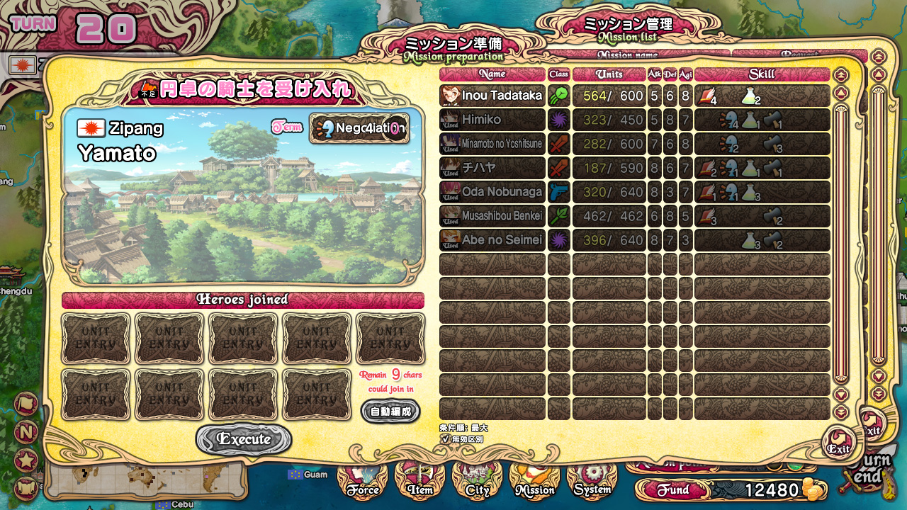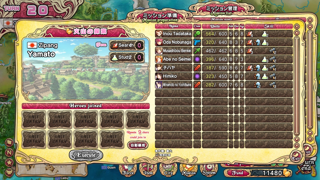 Чем ещё можно заняться, когда у героев нет настроя болтать или сражаться? Ну, для начала можно ознакомиться со списком доступных на данных момент миссий, выполнение которых будет приносить нам золото, предметы для экипировки юнитов, возможность выучивать специальные техники, эвенты с девушками и CG-арты в коллекцию. Каждая миссия требует определённое количество очков каких-то из шести навыков персонажей. К примеру, для выполнения миссии, показанной на скриншоте справа,