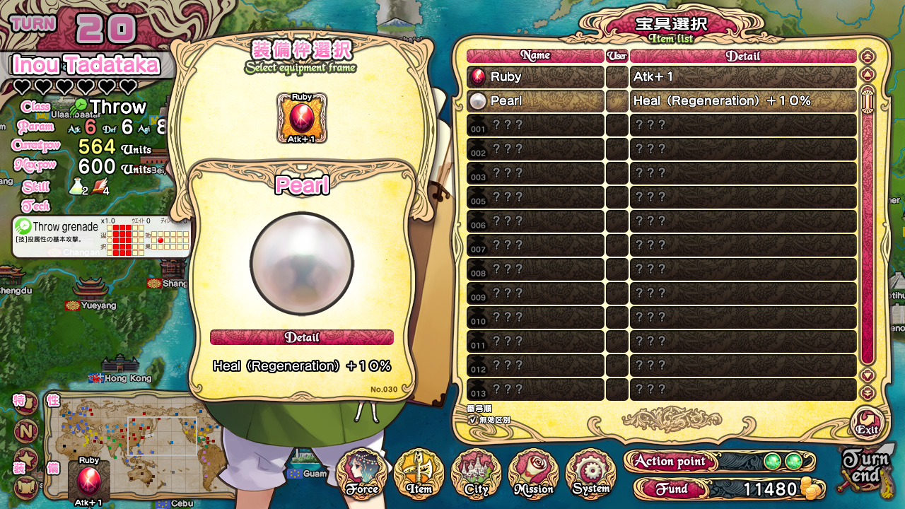 Персонажей можно также экипировать предметами, получаемыми после выполнения различных миссий. Для этого необходимо нажать на кнопку «Item», выбрать нужного героя и кликнуть на пустую рамочку в появившемся окошке. Нам откроется список вещей, которые удалось собрать, и их полезные свойства. Просто выбираем любой из них. Предметы без проблем можно снимать или менять на другие, но только тем героям, которые ещё не были использованы за текущий ход. Поэтому желательно этим заниматься в начале своего хода.