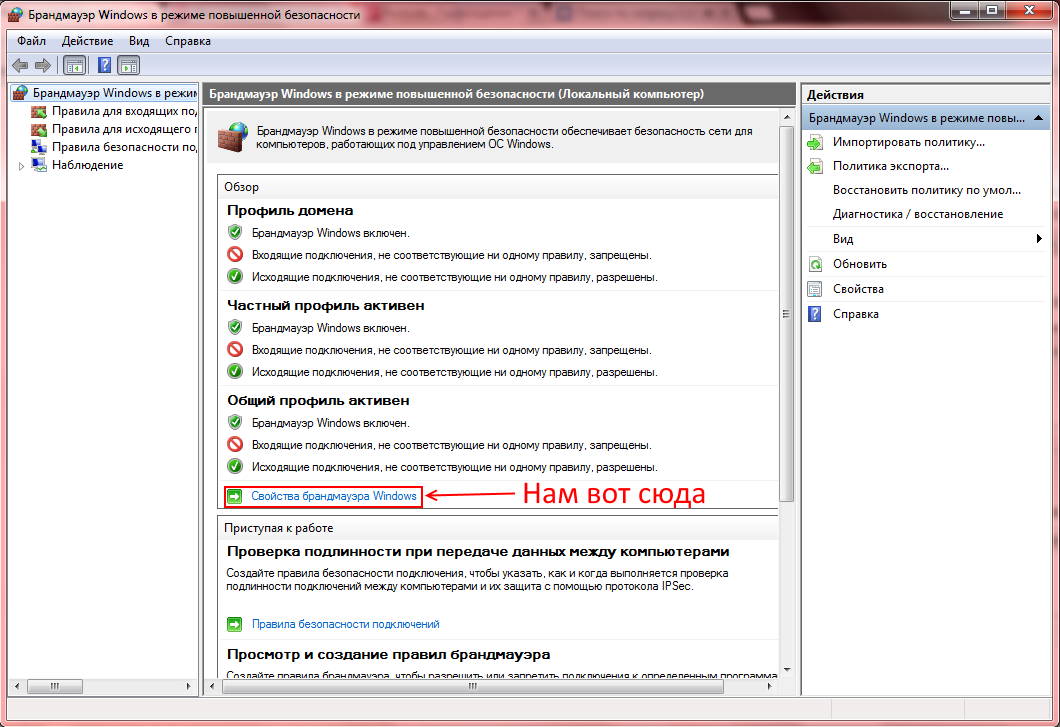 Перед нами открывается окно брандмауэра. Нам нужны его свойства.