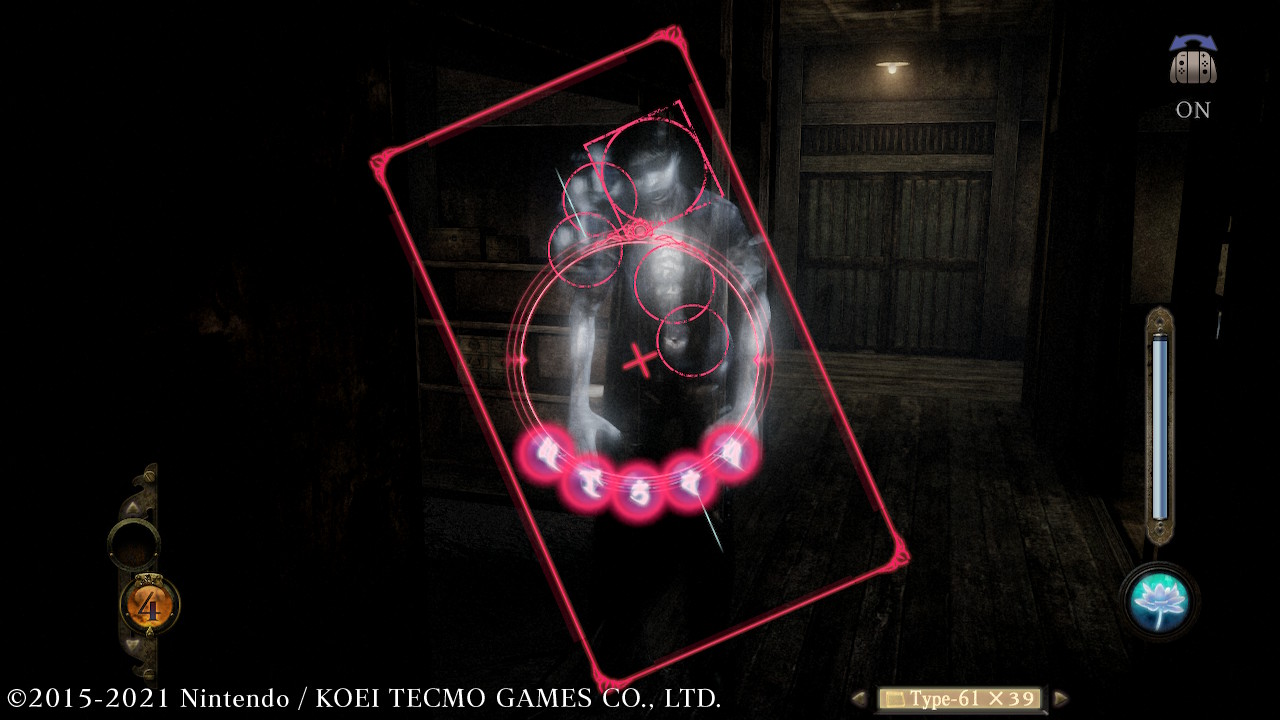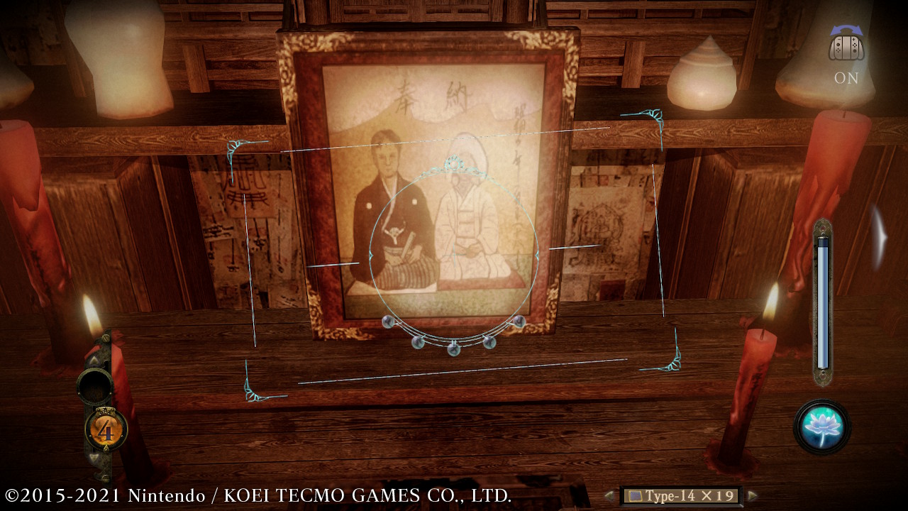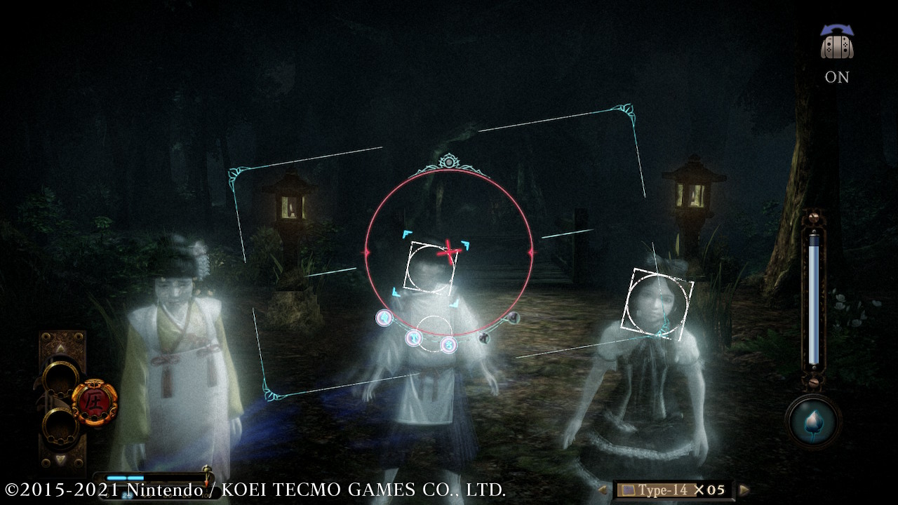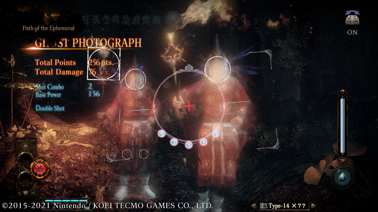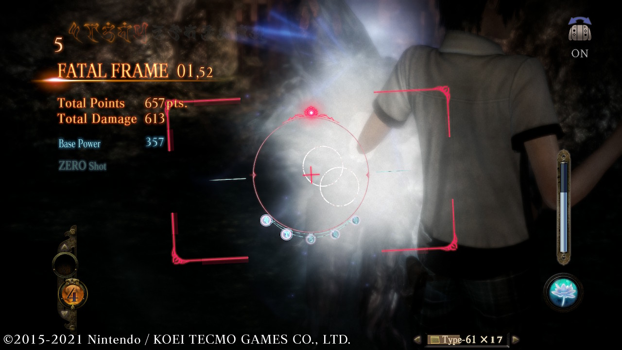 На фото 1) призрак пойман в объектив, осталось дождаться его атаки и начала отсчёта Fatal Frame; 2) группа призраков попала в объектив и испытала на себе серию Fatal Frame снимков Камеры Обскуры все снимки делаются бесплатно по перезарядке, поэтому слева написано ZERO Shot, так что можно как из пулемёта набить 5+ снимков, как правило, уже на 3-4 снимке призраки распадаются в кашу, которую вы видите на этом скриншоте, поэтому красиво заснять серию Fatal Frame особое умение.