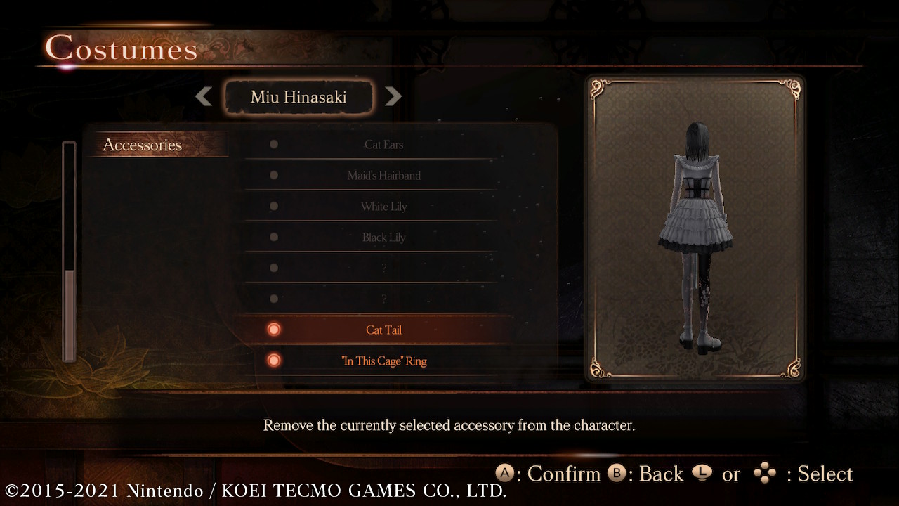 На фото 1) есть две секции костюмов А) наряды Б) аксессуары, которые можно по-разному сочетать, на скриншоте default костюм для Юри, доступный с самого начала игры; 2) готический наряд для Мию тоже доступен с самого начала игры, а вот кошачий хвостик-акессуар это уже награда за прохождение на Normal сложности.