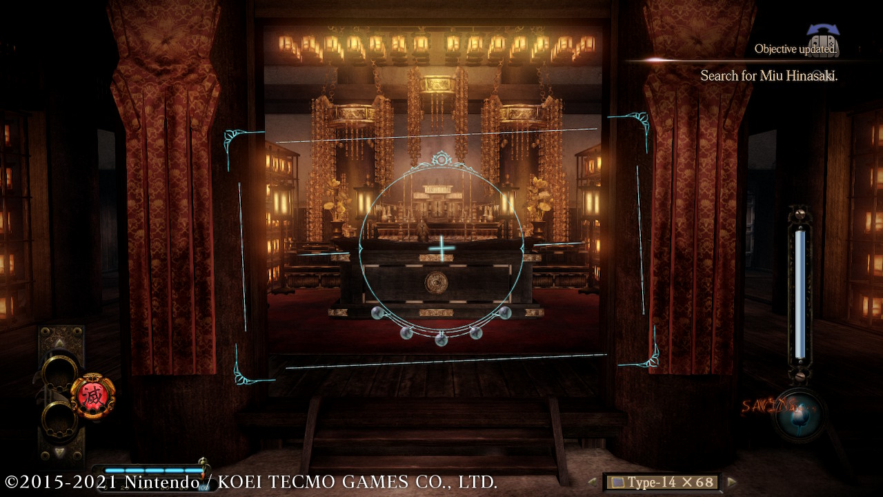 На фото 1) Юри Кодзуката в поисках спрятанных детьми-призраками куколок-подношений по одному из первых сайд-квестов игры, место действия Дом Кукол; 2) расположенное на верхнем этаже Святилища Бесформенного ритуальное место хранения артефакта Зеркало Чёрного Солнца, который принадлежит Чёрной Жрице и служит единственным способом как запечатать или распечатать особый деревянный реликварий с Дай Хаширой. Свет с небес, поступающий в зеркало с отверстия в крыше, преломляется и отражается в центральную печать на реликварии.