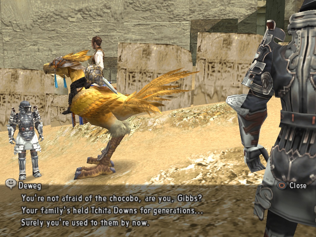 За последний квест вы получите Barheim Key, который позволит вам вернуться назад в Barheim Passage. Рекомендую забежать туда и активировать кристалл телепортации (но не вздумайте бежать в неизведанные области, монстры там очень сильны и попросту убьют всю команду), после чего телепортироваться в Нальбину. Там мы возьмём в аренду чокобо (800 Gil). Подойдите к двум солдатам, которые перегородили дорогу на север и начнётся небольшая сценка. Один из солдат, похоже, жил долгое время в семье, которая занимается разведением этих пернатых и просто ненавидит запах жёлтых птиц. Парень убегает, а за ним и его напарник путь свободен.