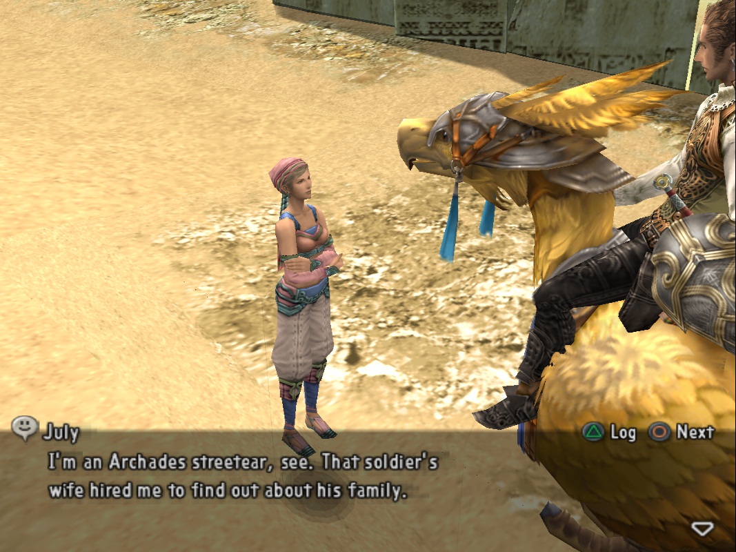 Наша команда наконец-то выбралась на поверхность и оказалась в старом районе Аркадии. Теперь, это пристанище для тех, кого изгнали из города и бедняков, а проход в центр города охраняется. Поговорите с охранниками на посту (выберите любой вариант разницы никакой) и начнётся небольшая сценка, в которой мы встретимся со старым и неприятным знакомым Балфира, по имени Jules. Он знает о пути в Аркадию, но не собирается нам помогать просто так и хочет подзаработать немножко деньжат на наших проблемах. Для начала, придётся отдать ему 1500 Gil и тому понадобится одна из сплетен: