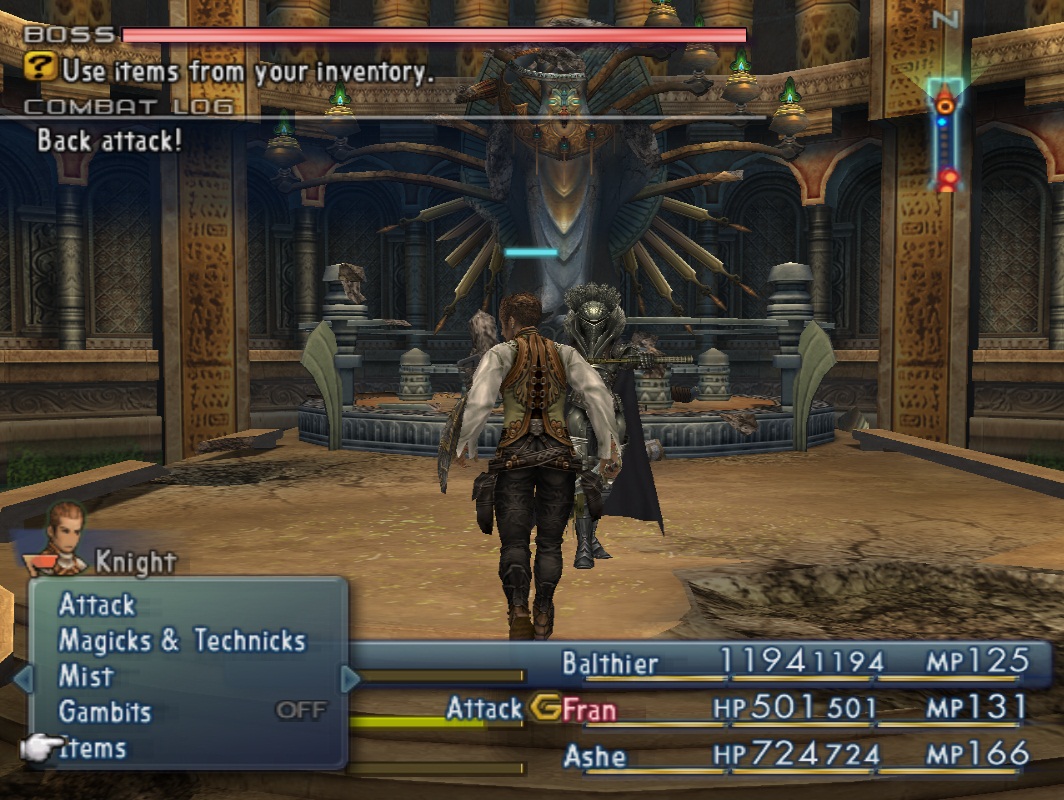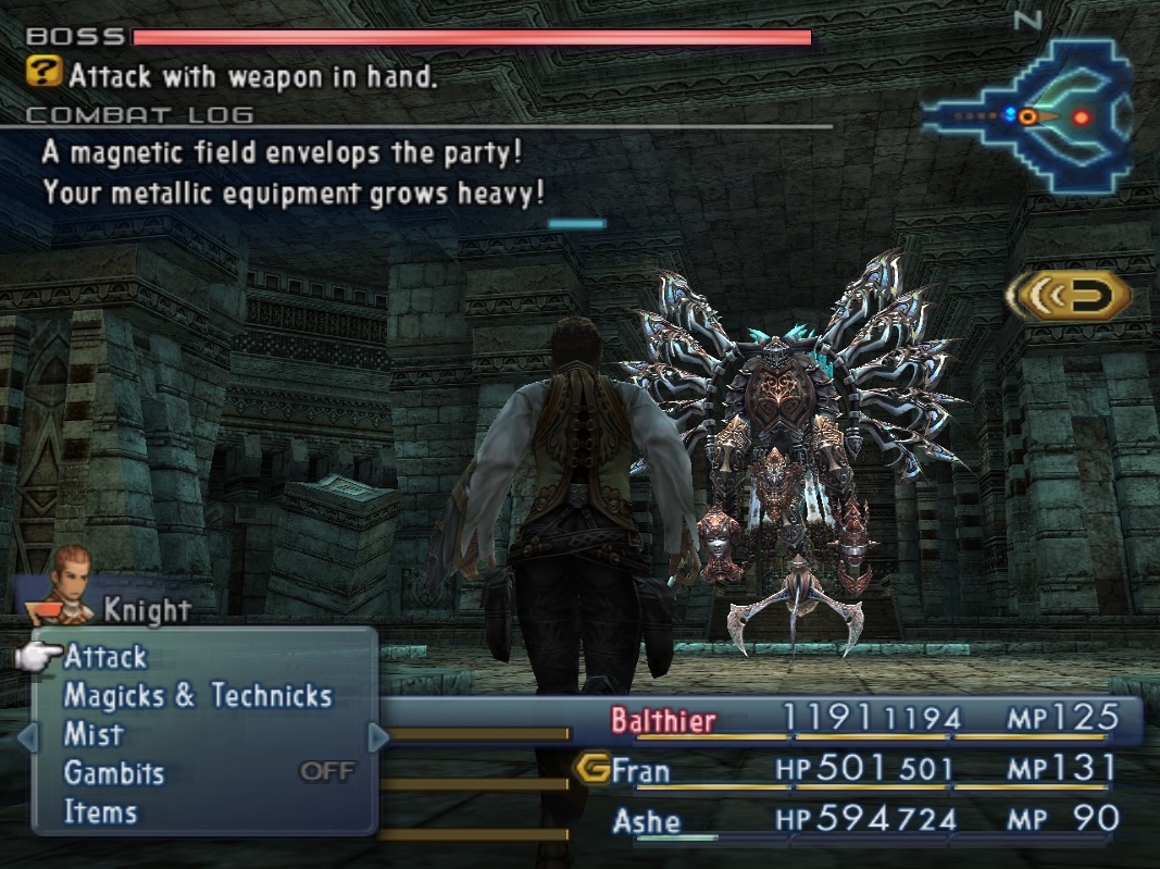 Хорошо, не будем питать ложных надежд, битва предстоит довольно серьёзная и, скорее всего, у вас не получится пройти её с первого раза. Итак, нам необходимо чтобы каждый персонаж имел как можно больше квикенингов. Это касается всех персонажей: как основных, так и тех, кто отсиживается в резерве. Лучшая возможная экипировка (и я говорю не про магазинную фигню, а про украденные\купленные на базаре тряпки, которые гораздо лучше) просто must have. Пригодится Warp Mote, Белиас и всё что попадёт под руку. Nihopalaoa у вас, скорее всего, ещё долго не будет (да и если уже есть, то необходимость применять его в этой битве пропадает), так что будем выкручиваться поинтереснее. Оставьте в активном составе только одного персонажа, который призовёт Эспера, а остальных спрячьте в резерв. Скорость битв в настройках должна быть выставлена на самую медленную, а режим ATB на wait.