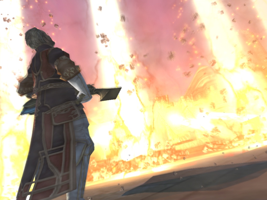 Пора бы выходить на свежий воздух! Телепорт всегда к вашим услугам, так что вылетайте из храма и увидите, как в небе у горы парит целый флот кораблей империи. Нет сомнений, это прибыли за Ларсой по поручению Вэйна. Из храма виден дым, так что пора лезть в самое пекло…