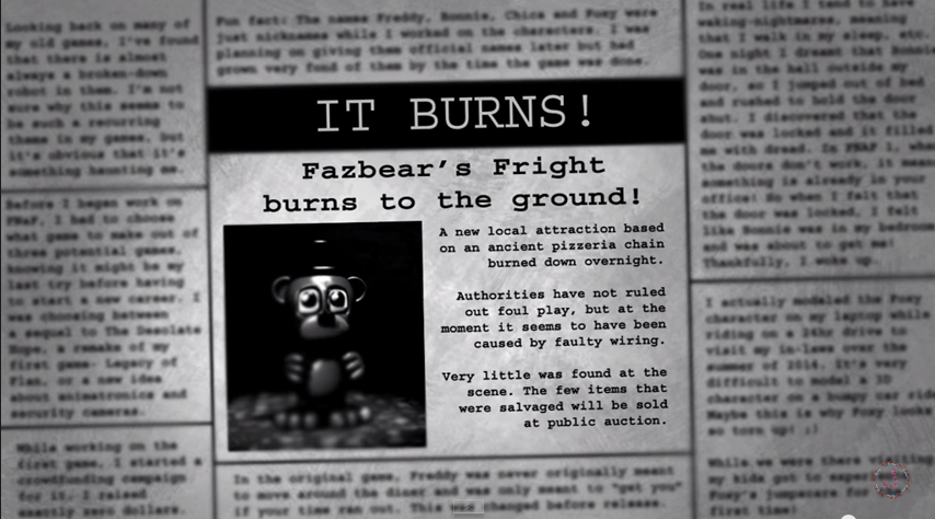 Здравствуйте, дорогие читатели! Просматривая видео по FNaF 3, я заметил одну очень интересную деталь, связанную с концовкой игры (в которой Дом Ужасов сгорает дотла). Что же там может быть, помимо Спрингтрапа на фотографии в газете?