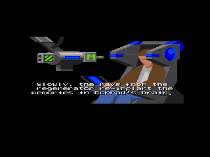 Первые подозрения того, что нам не придётся вновь собирать бананы, звёздочки и прочие сердечки начинали возникать уже после знакомства с первыми кадрами вступительного ролика, в котором главный герой пытался уйти от преследования неизвестными и в процессе стремительной погони терпел крушение на одном из спутников Сатурна. Вот так, без лишних церемоний игрока помещали в условия чрезвычайной ситуации в неизведанной среде, а кроме того давали возможность лицезреть в действии технологию ротоскопирования, повсеместно задействованную в игре и являющуюся по сути предтечей современного motion capture. Что же мы видели после неудачного прититанивания (т.е. процесса плавного соприкосновения летательного аппарата с поверхностью спутника Сатурна — Титаном)? Почва, полностью покрытая мхами и какими-то неизвестными травами. Всюду кустарники тропического типа, заброшенные футуристические конструкции практически «сросшиеся» с местным ландшафтом, исполинские деревья, окутанные лианами — всё это было приятно глазу и отрисовано вручную. Наш подопечный, недолго думая, встав и отряхнувшись, обнаруживает, что ничегошеньки не помнит. Однако, изучив местность, он находит поблизости весьма полезное устройство — голокуб, который содержит информацию, транслируемую посредством голографической видеозаписи. Познакомившись с первым флэшбеком, протагонист узнает своё настоящее имя (Конрад Б. Хард), а также план действий на ближайшее будущее — перво-наперво отправиться к своему другу Яну в Нью-Вашингтон, оставаясь при этом в тени.