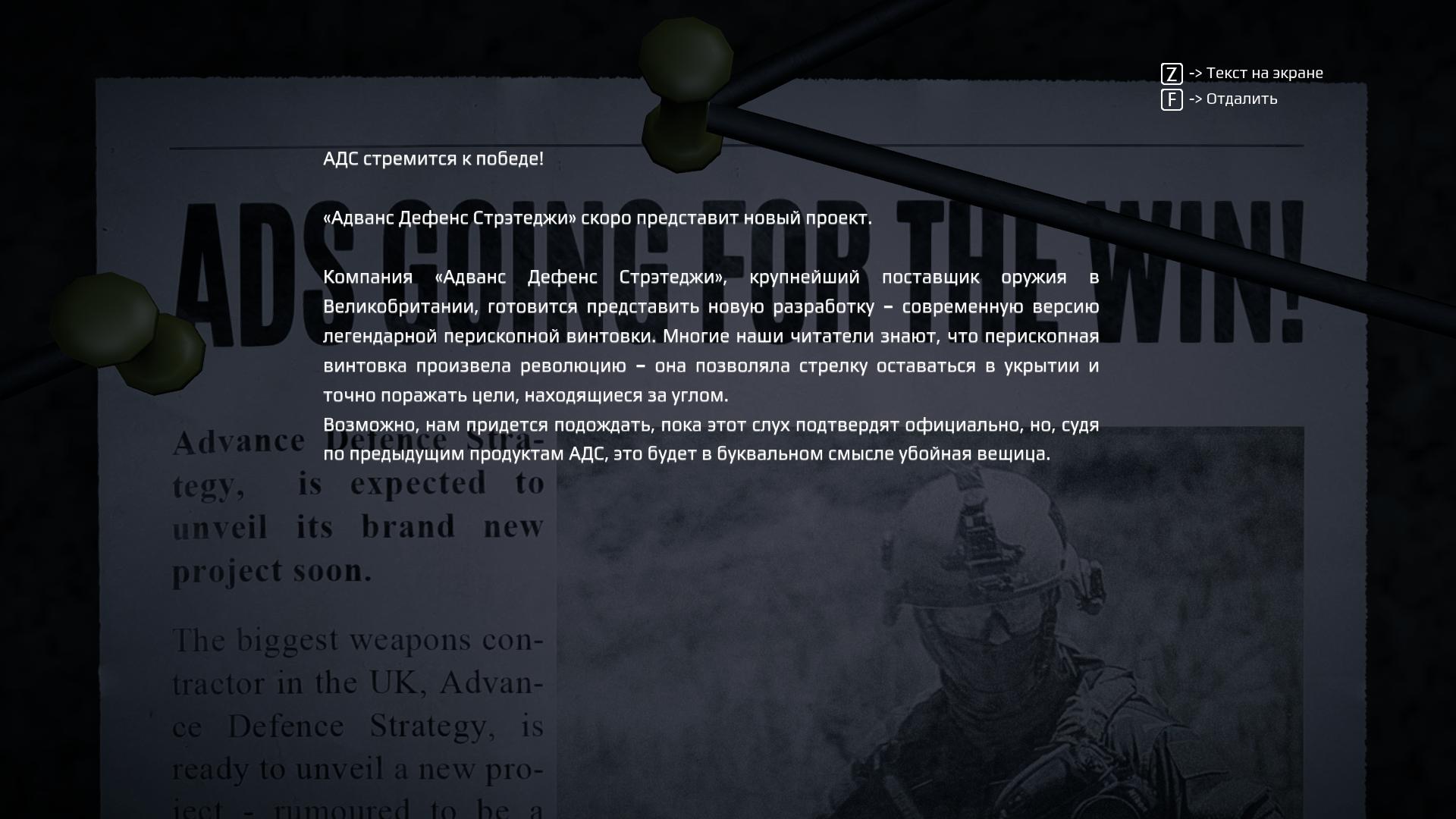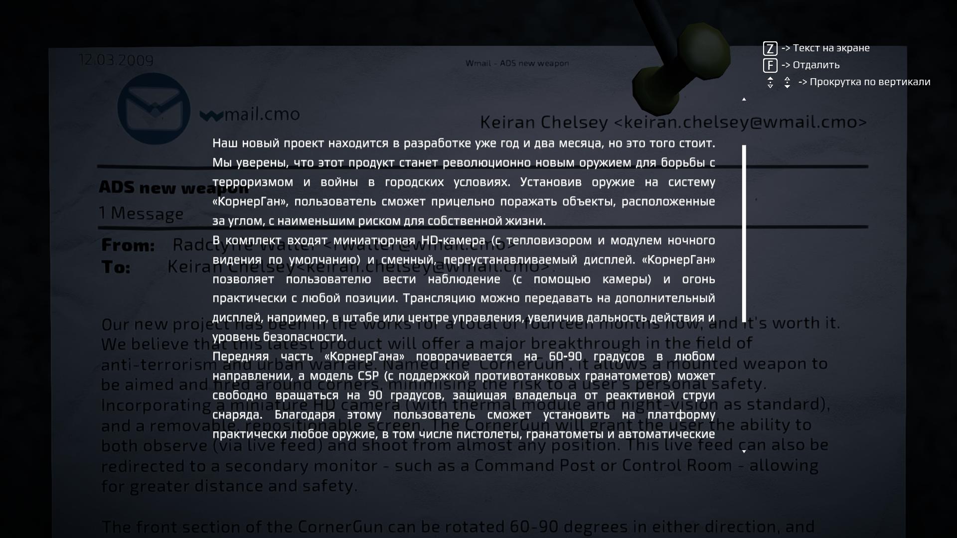 В данной игре была реализована, на мой взгляд, весьма оригинальная фишка с «Корнер-Ганом». Это приспособление, позволяющее подсоединить к нему стрелковое оружие, после чего можно, оставаясь в укрытии, высовывать оружие из этого укрытия и целиться во врагов при помощи прицела, который отображается на смартфоне, подключенному к этому Корнер-Гану. Оригинально, но к сожалению не в той игре это реализовано! При геймплее, где стрельба отнюдь не главное и скорее второстепенное, а на первом плане идёт именно повествование, данная фишка просто чахнет, а жаль.