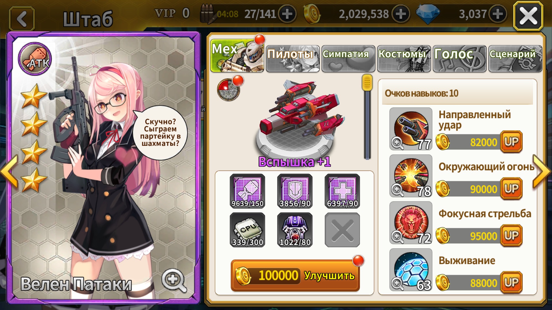 У каждого пилота четыре навыка, улучшаются они за золото. Чем выше уровень, тем дороже стоит улучшение навыка. Начинается всё с 200 монет, а заканчивается сотнями тысяч. Прирост эффективности навыка за каждый уровень незначительный, но когда это десятки уровней разница налицо. Бежать и улучшать навыки при получении нового уровня пилота рекомендуется только если у вас много денег, и только для реально полезных пилотов.