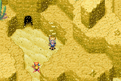 Сама пустыня расположена к югу от города Сухалла. Заходите в песчаную зону на Мировой карте. Как только войдете, идите вправо пока вам не покажут кат-сценку с песчаной бурей. Если вы попадете под действие бури, и будете бездействовать, вас выкинет из пустыни на Мировую карту. Раненные солдаты упоминали вам о том, что для того, чтобы пересечь это место, вам понадобится вода. Поставьте Псинергию Погружение на клавишу быстрого доступа (L или R), этот скилл – наш козырь. Теперь, когда вы попадете в песчаную бурю, быстро используйте Погружение и вместо того, чтобы вас перенести за пределы локации, вам предложат сразиться с монстром.