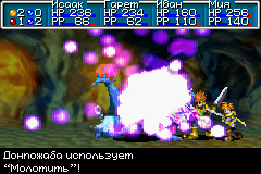 В первом раунде примените найденную вами Каплю Масла. Применяйте ваши самые мощные Псинергии. Не забывайте про Орехи – ваше количество Очков Здоровья не позволит вам расслабиться. Пользуйтесь Джиннами. Например, Сап помимо удара, восстановит вам полоску жизни. Копите на Призыв, а потом добивайте вашего противника.