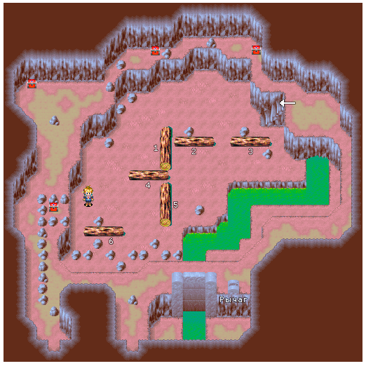 1 Прокатитесь на бревне вверх. 2 Перейдите на вертикальное бревно и прокатитесь на нем вправо. 3 Дойдите до бревна под номером 3 и прокатитесь на нем вверх. 4 Перейдите на бревно справа (бревно под номером 2) и прокатитесь на нем влево. 5 Перепрыгните на бревно ниже. 6 Прокатитесь на этом бревне влево. Теперь вы на противоположном берегу и можете забрать содержимое сундука и выйти из комнаты.