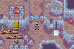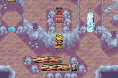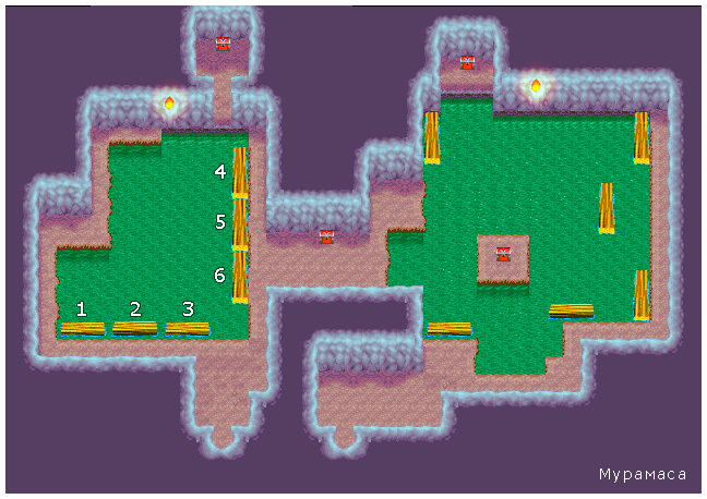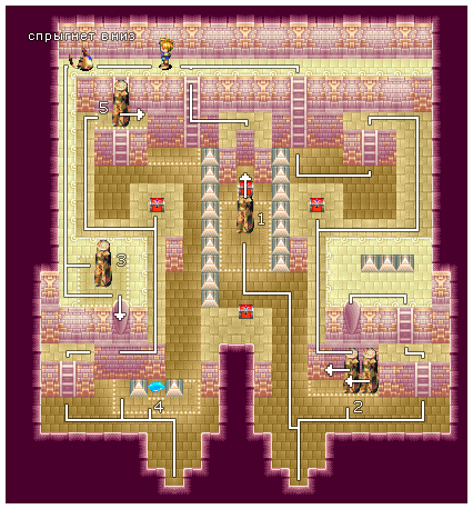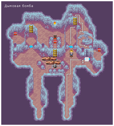 1 Подойдите к каменной глыбе с сундуком и передвиньте её до предела вверх. Так, чтобы вы потом могли достать до сундука. 2 Левую глыбу передвиньте на две клетки влево, правую глыбу на одну клетку влево. 3 Сбросьте глыбу вниз, используя горку. Потом сами прыгайте вниз. 4 Заморозьте лужу, потом идите к лестнице слева, поднимайтесь наверх и перепрыгивайте, так, как указывает вам стрелка на карте. 5 Сталкивайте глыбу вниз и двигайте её так, чтобы она закрывала лестницу. Потом поднимайтесь наверх (пользуйтесь открытой лестницей), спускайтесь вниз по закрытой глыбой лестнице, таким образом вы остановитесь на глыбе и сможете перепрыгнуть к сундуку. |