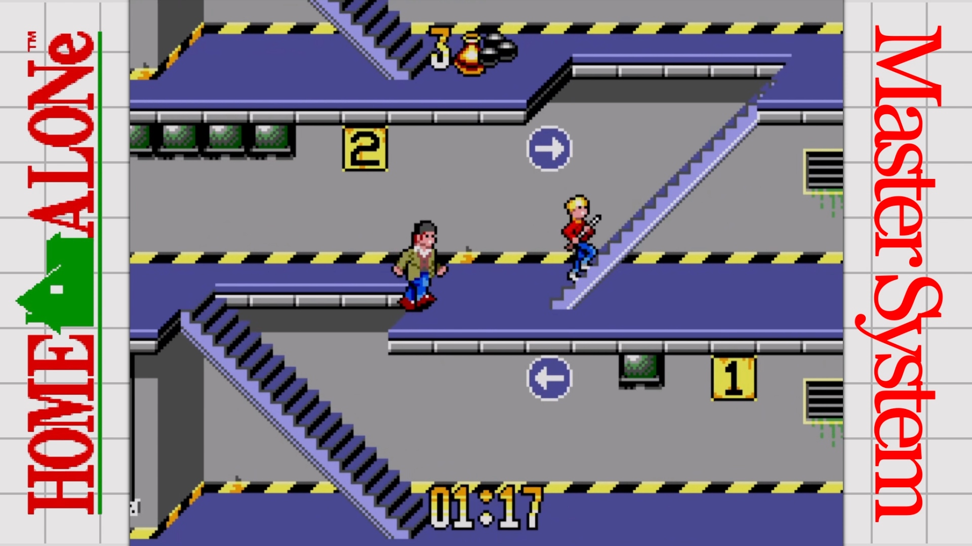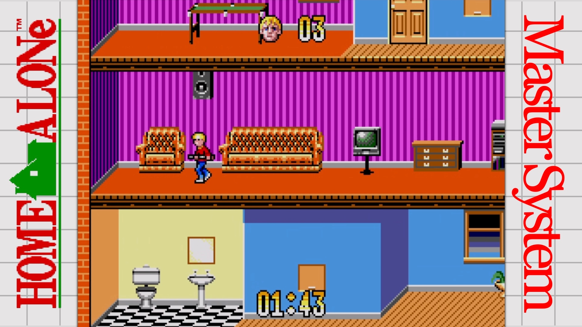 Геймплейно Home Alone на Master System напоминает помесь Mappy с Bonanza Bros. Управляем Кевином, вытряхиваем из дома все драгоценности и передислоцируем их в сейф, чтобы они не достались Мокрым Бандитам. Ружжо наше, правда, не стреляет, ведь на тропу войны Кевин вышел без патронов… И без плана действий, так что придётся знакомиться с задумкой разработчиков через боль первых поражений. Сначала требуется перепрятать 1-2 блестяшки, но по мере прохождения их будет всё больше и больше. А таскать с собой Кевин может не более 3 единиц хлама за раз, т.ч. из платформера игра в какой-то момент превращается в адовый менеджер идеальных маршрутов. Стоит Гарри или Марву схватить цацку первыми, они двинут к выходу, и если дойдут, то — всё, гамовер. Также гамовер случится, если вы позволите себе быть пойманным кем-то из бандосов или не успеете уложиться в ограничение по времени.