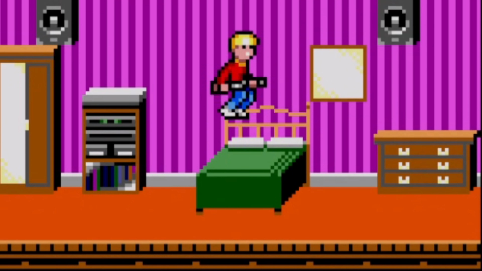 Платформинг хоть и делает моему мозгу больно в районе логики, но в целом вызывает больше кайфа, чем фрустрации. Дом Маккаллистеров мы видим в разрезе, и Кевин каким-то на хрен образом умудряется спрыгивать с верхнего этажа на нижний сквозь декорацию. Обратно, кстати, тоже, — но для этого ему нужно что-нибудь упругое. Например, диван. Собственной упругости здешних кроватей хватит для того, чтобы отправить вас на этаж выше, но если прилететь на них сверху, то вы перелетите аж через этаж. Жулики так не умеют и вынуждены пользоваться лестницами. Мы тоже можем бегать по ступенькам, но «бегать» — это слишком громко сказано. На лестницах Кевин превращается в Саймона Бельмонта, становясь таким же медлительным и неуклюжим. Хорошо хоть ружьё держит наизготовку, и если вы найдёте-таки к нему патроны, то лестничные проёмы станут большой проблемой уже не для вас, а для бандосов.