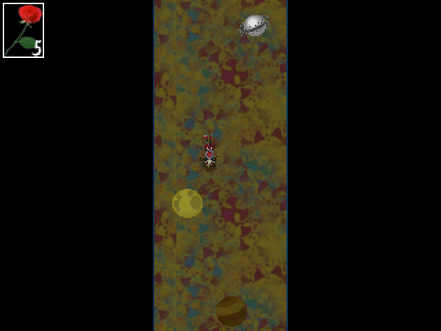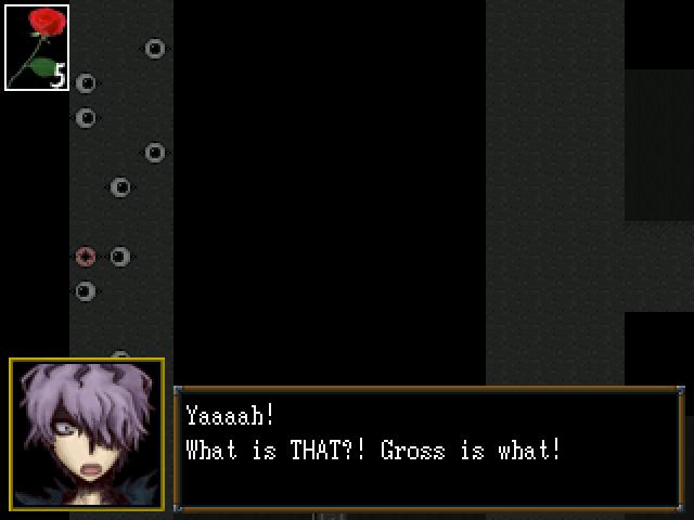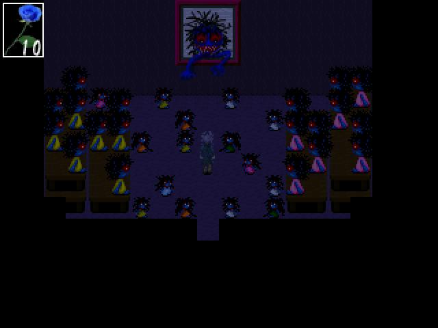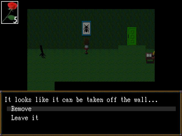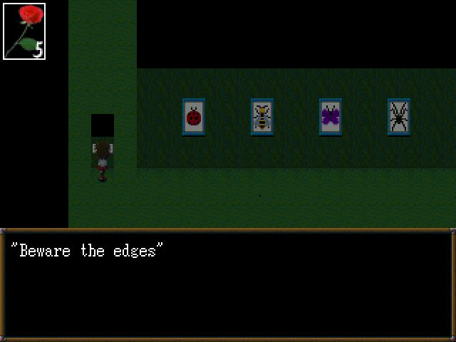 Не пытайтесь пройти через скульптуры роз, иначе попадете в ловушку и умрете. Сейчас вам нужно пройти по другой дороге и выйти к большим часам и двум дверям. В левую дверь зайти можно, однако вам придется выйти из-за непроглядной темноты. Зайдите в другую дверь. Для начала подойдите к хвосту гигантской змеи и вытащите ее, чтобы открыть себе короткий путь снаружи. Затем пройдите наверх по узкому коридору, избегая вылетающих из стен мечей. Осмотрите картину слева и освободите бабочку из заточения. Поймайте ее и выходите из комнаты. Будьте осторожны: картина «ошибки» выпрыгнет из рамы и начнет бродить по комнате. Он может даже выйти наружу через дверь. Не подходите к нему слишком близко.