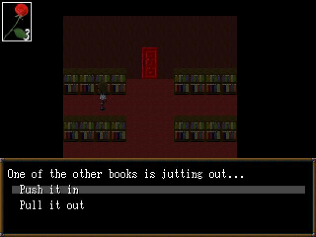 Осмотрите третий книжный шкаф в левом верхнем углу. Иб обратит внимание на одну из книг. У вас появится выбор, прочитать ее или нет. Если решите прочитать, то сможете посмотреть видеоролик, после которого дверь откроется. Однако здесь может быть баг и вместо этого игра вылетит. Если баг есть не читайте книгу. Иб заметит, что другая книга падает с полки. Поставьте ее на место, и дверь будет открыта.