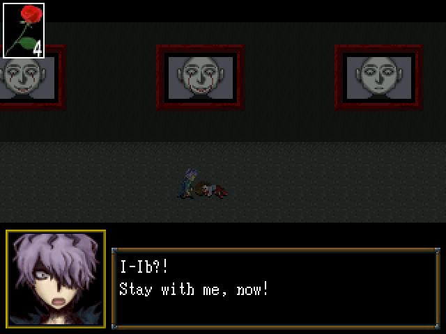 Если Гарри открыл дверь: когда к вам вернется управление, идите к открывшейся двери. Позвольте Гарри подняться по лестнице. Управление перейдет к Иб. Поговорите с Мэри, затем зайдите в комнату с пропастью. Благодаря краскам, мы теперь можем пройти через нее и взять ключ. Открывайте дверь рядом с рыбаком. Гарри и Иб снова встретились.