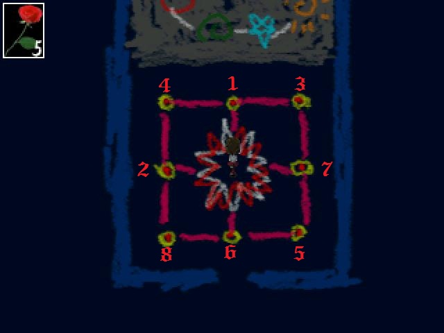 Если вы хотите получить одну из двух ранних концовок, которые были добавлены в патче 1.04, вам нужно нажать на еще одну кнопку. Она находится на первой колонне слева в верхнем ряду. Иб увидит неприятную картину, а вы сделаете первый шаг к получению концовок. Учтите, что выполнение всех действий помешает вам получить некоторые из других концовок. Если вы проходите игру в первый раз, вам лучше проигнорировать последующие шаги.