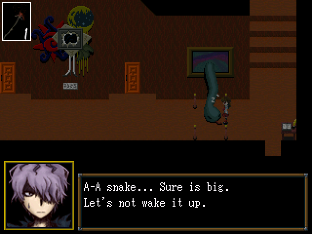Спускайтесь по лестнице. Пройдя через дверь, сохраните игру и восстановите здоровье, если нужно. Двигайтесь дальше, пока не дойдете до большой змеи. Пройдите вверх до дыры в полу, осмотрите ее и поговорите с муравьем. После, зайдите в небольшую комнатку с картинами. Ту, что висит в самом дальнем углу можно снять и взять с собой. Вернитесь обратно и положите картину на дыру в полу.