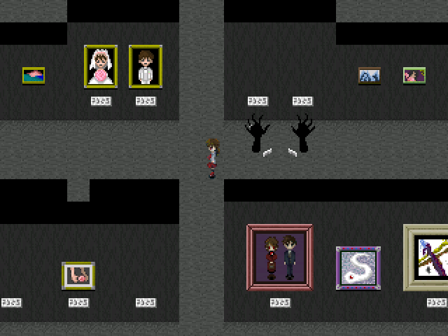 После того, как Иб прыгнула внутрь, мы окажемся в настоящей галерее. Спуститесь на нижний этаж. Здесь Еву уже ждут родители и ее сестра Мэри.