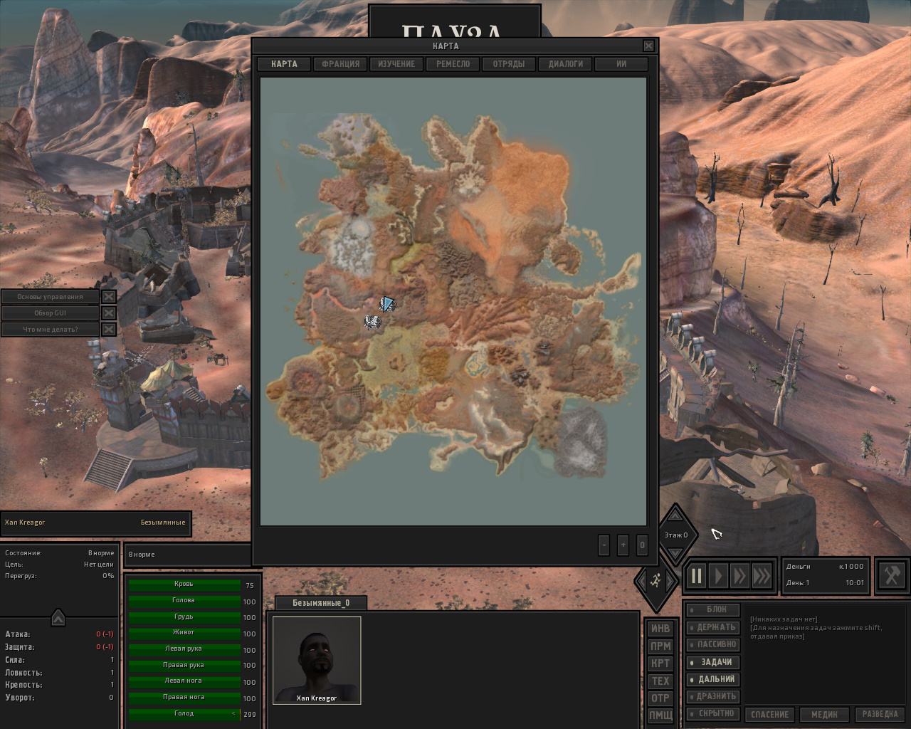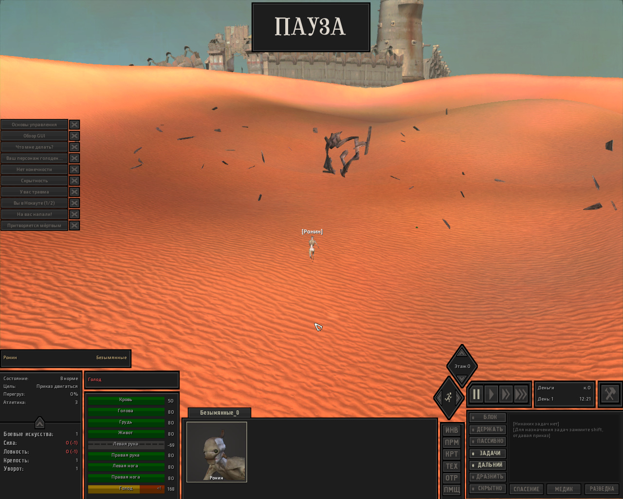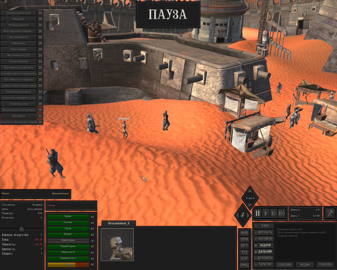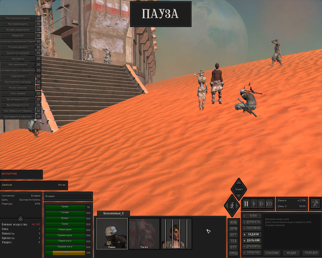 В данном разделе, при помощи рекомендуемого мной выше игрового старта «На дне», я на собственном примере покажу вам некоторые базовые вещи, а также расскажу о нескольких геймплейных трюках, которые помогут пережить первые (самые тяжёлые) игровые недели и сделают ваше дальнейшее прибывание в мире Kenshi чуточку комфортнее. Итак, поехали!