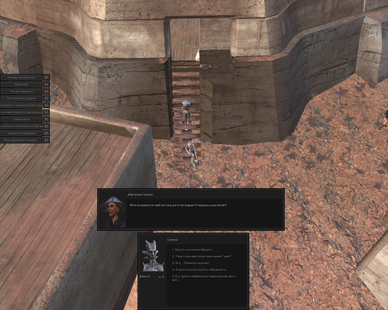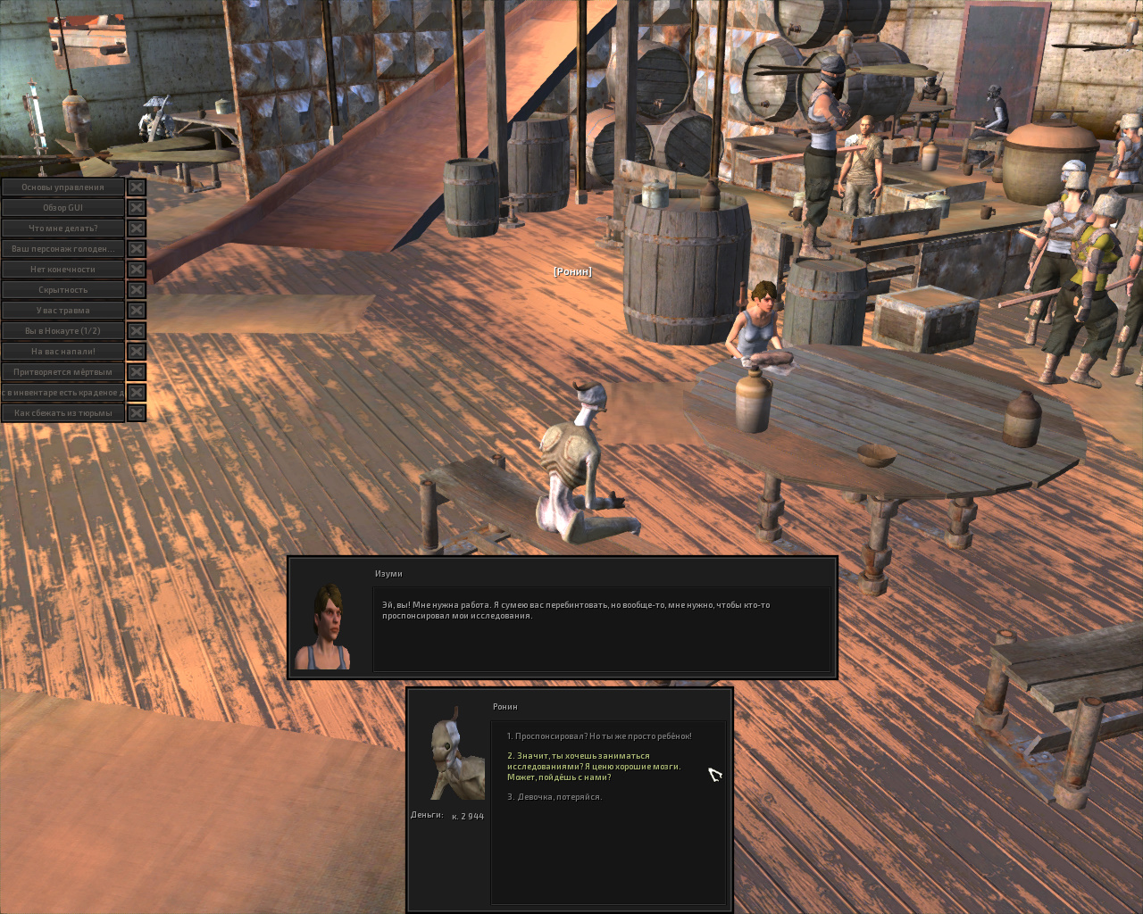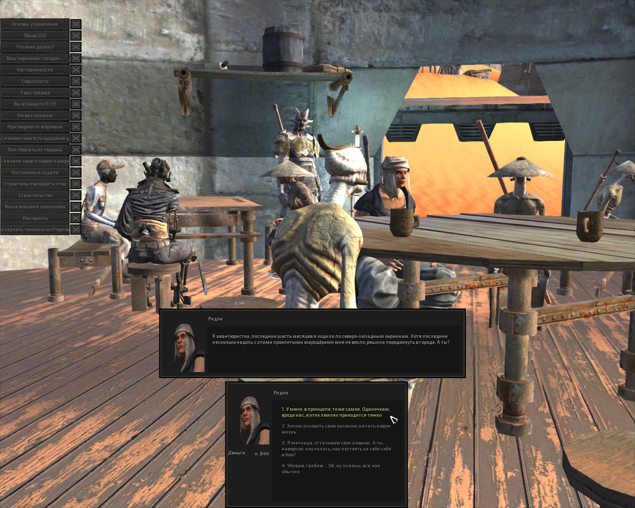 Прим. автора: Сразу после того, как вы удовлетворите основные потребности вашего персонажа, обязательно пройдитесь по всем городским барам и забегаловкам «Шо-Баттаи», найдите гигантскую «бодибилдершу» по имени «Ридли» и обязательно, поговорите с ней. Очень важно сделать это до того, как вы наймёте кого-то другого в свой отряд. В противном случае, вы рискуете пропустить прокачанного и очень полезного на первых парах напарника, который присоединится к вам абсолютно бесплатно. Перестало быть актуальным после одного из крайних обновлений. Вместо неё ищите теперь шека по имени Эллс. Где-то на вторые сутки, начинает бессистемно бродить по поселению. Стоимость данного субъекта всего три сотни местных денег. Окупается сразу же, содержимым своего, собственного инвентаря. Из однозначных минусов, за его голову назначена небольшая награда в 1000 катов. Впрочем, она сама со временем спадёт, главное до этого момента не попадаться на глаза местным стражам. Вариант (честно признаться) сильно похуже, но за неимением гербовой бумаги, иногда приходится писать и на туалетной.