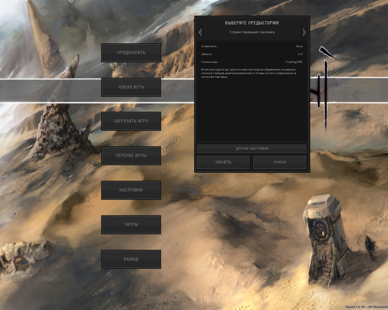 Первое, что мы видим при начале новой игровой сессии это меню выбора предыстории. На конец 2019 года, игра предлагает 14 вариантов, каждый из которых тем или иным образом влияет на место появления, начальные условия, отношение с каждой игровой фракцией, количество человек или животных в отряде, а также начальную экипировку и стартовую сумму денег.