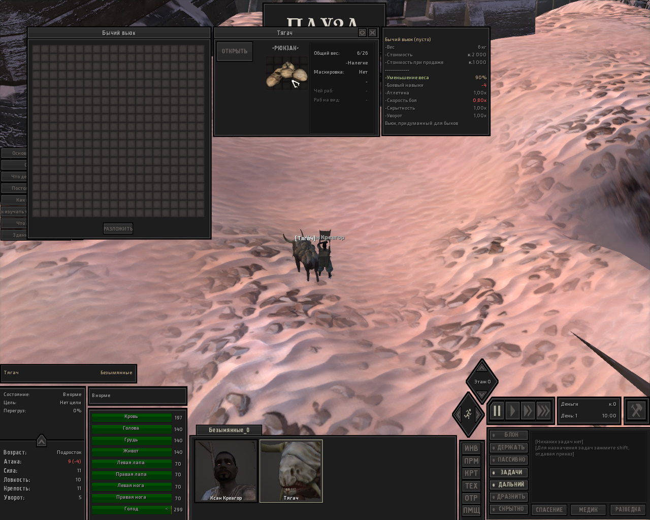 Исходя из предлагаемого мной стиля игры, возможность единовременно выносить на продажу как можно большее количество лута, кажется мне более приоритетной, по этому первым делом я рекомендую обзавестись каким-нибудь вьючным животным. Выбирать можно из двух видов. Первый это вислоухий кролик-мутант «Гару». Медленный, много ест, плох в бою, но зато носит гораздо больше и получить его намного проще. Второй «Вьючный бык» Бьёт больнее, кушает меньше, чуть быстрее передвигается, но при этом, у него не такой вместительный инвентарь. На территории «Великой пустыни», первые продаются как в Фермерских магазинах (ближайшие находятся в городах «Стоат» и «Груз» на юге от «Шо-Баттаия»), так и у бродячего каравана «кочевников», а вторые только у «кочевников». В зависимости от величины стартовых навыков, оба вида стоят в диапазоне от 3-х до 5,5 тыс. катов.